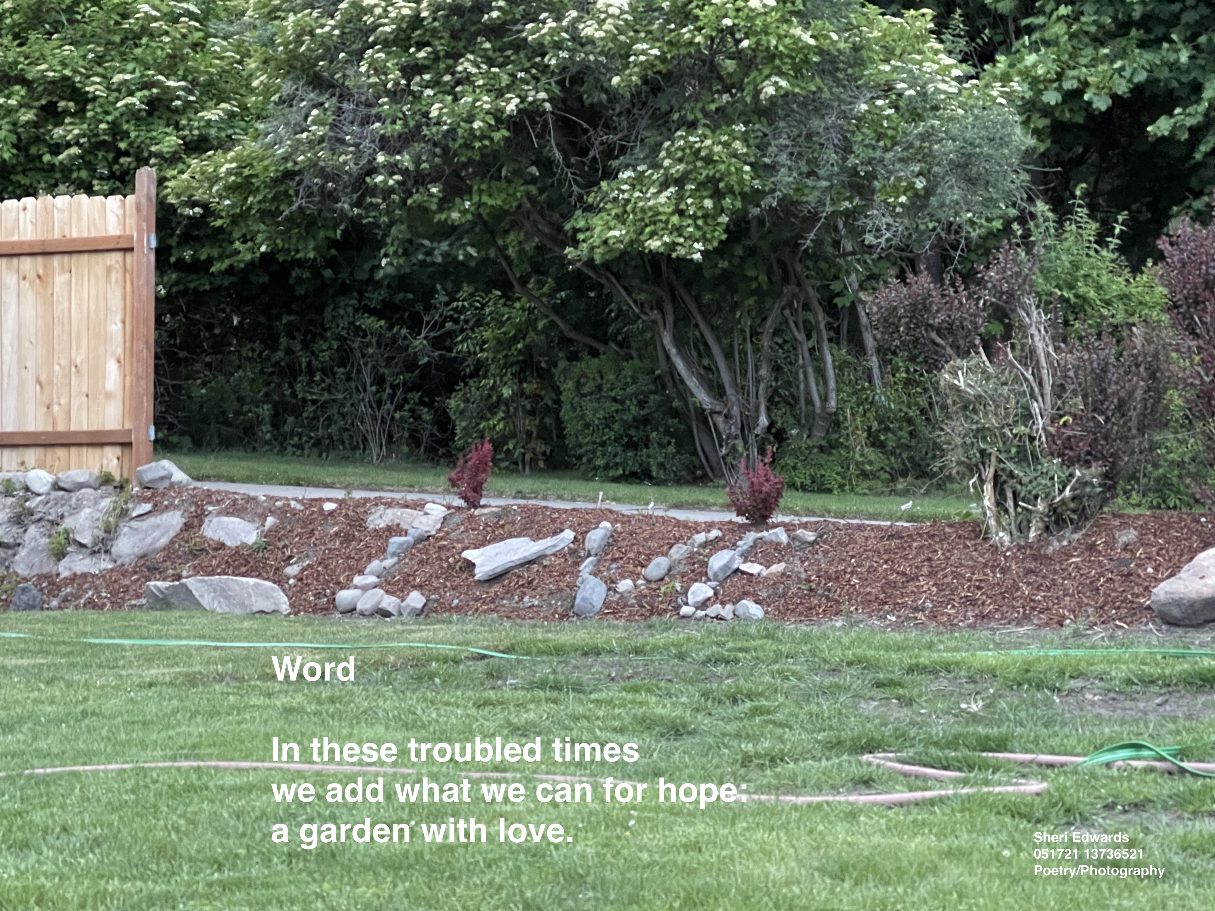 I took many pictures today, but this evening, I found the perfect picture– the finished side garden of our neighbors down the street, which is so fitting for our world today. This is hope.