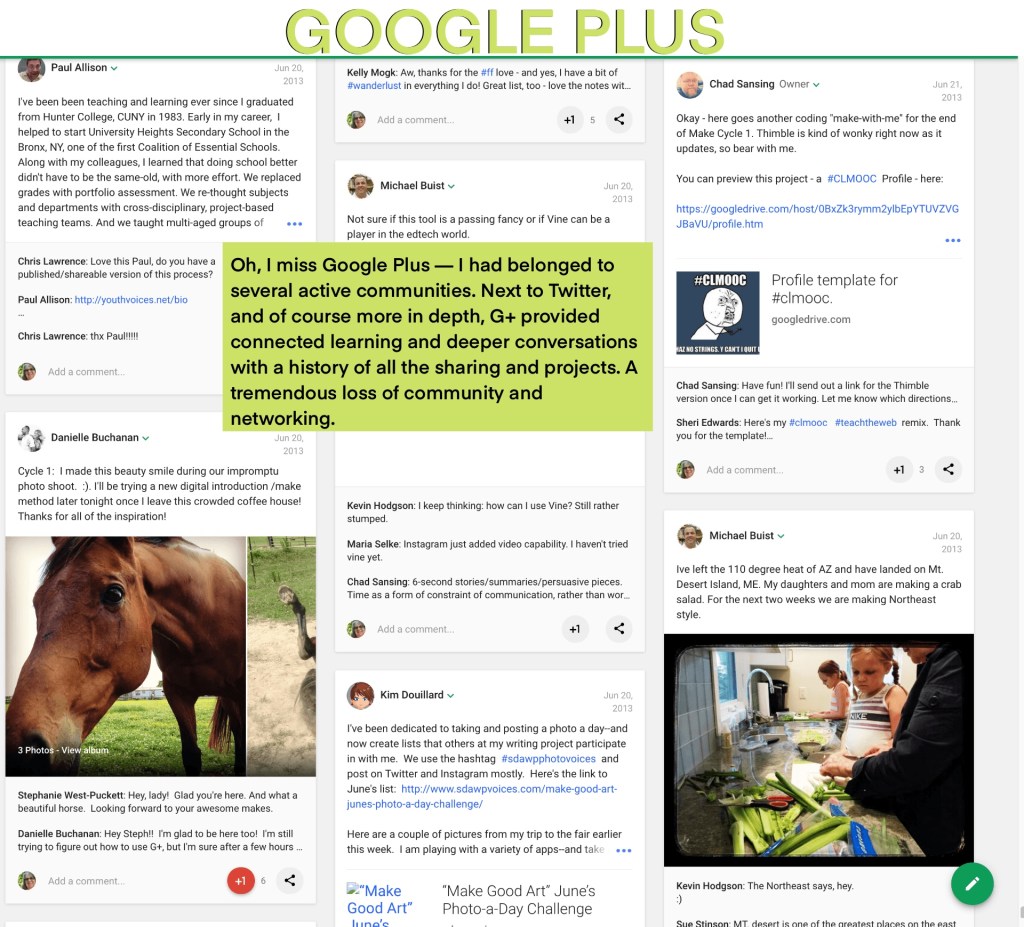 Oh, I miss Google Plus — I had belonged to several active communities. Next to Twitter, and of course more in depth, G+ provided connected learning and deeper conversations with a history of all the sharing and projects. A tremendous loss of community and networking.