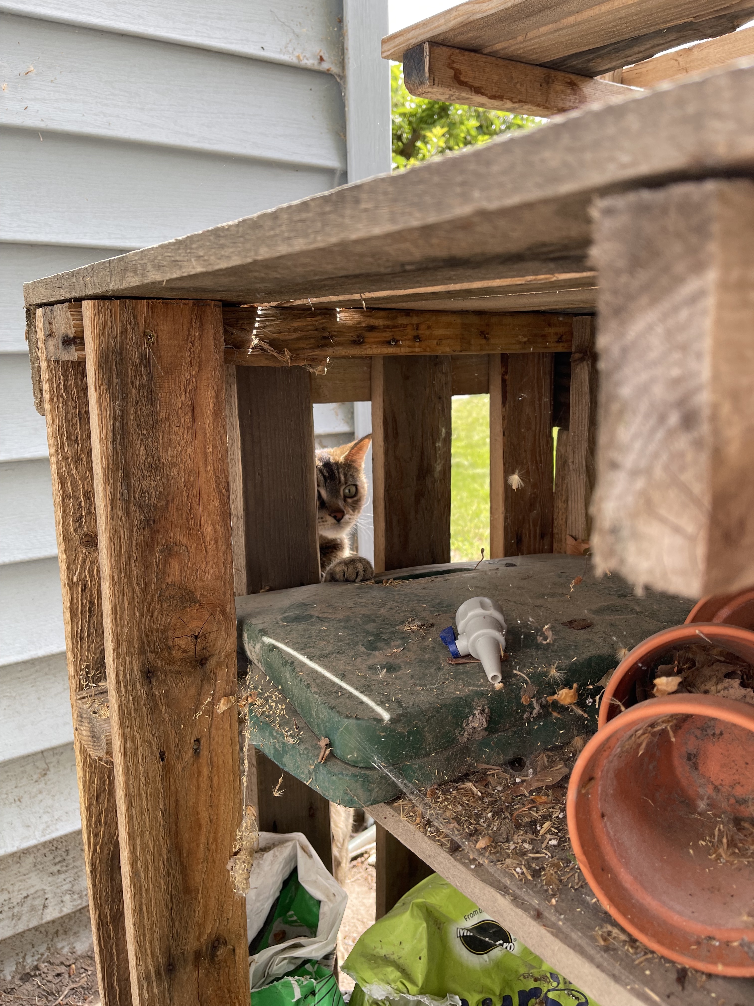 Here’s a pic of the cat spying on a shelf and probably a spider in the potting table.