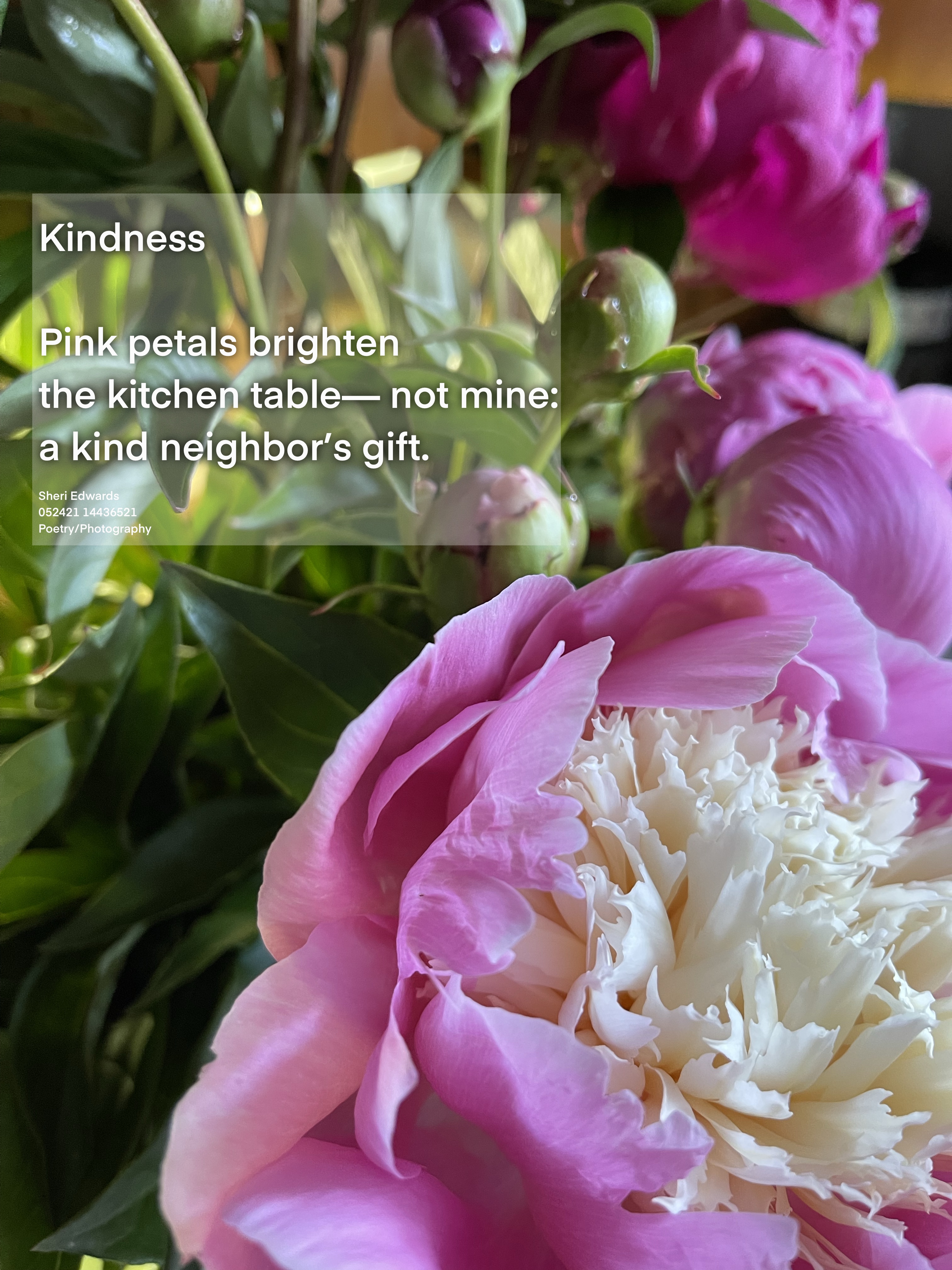 Every day, a photograph, a poem. The other day we walked by the neighbor’s house and stopped at their amazing garden, filled with giant peonies. My own peonies are small and often don’t even bloom. So these giant peonies were a sight to enjoy.