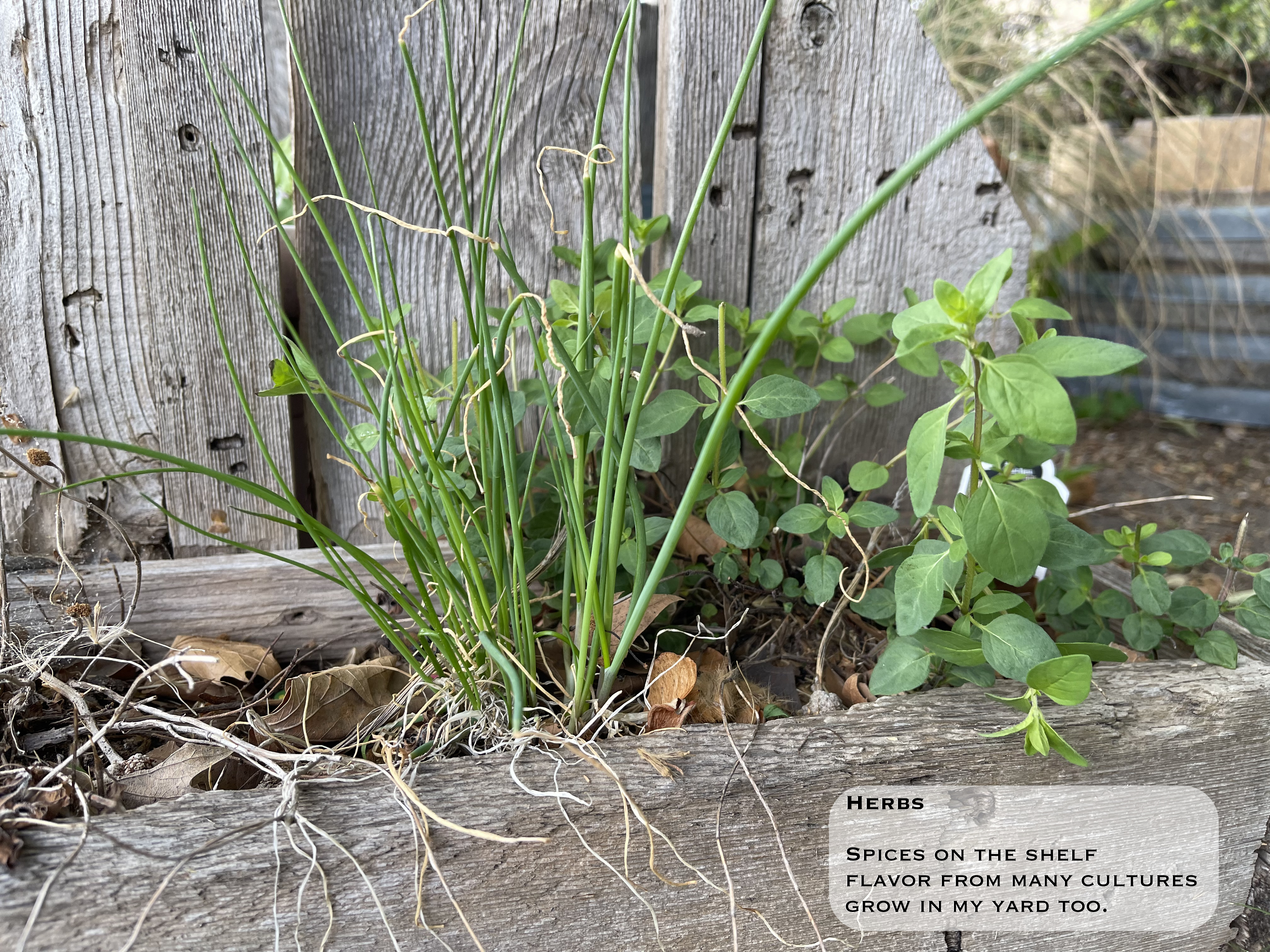 Every day, a photograph, a poem. Another slow, cold day today, but I was delighted to find the oregano and chives from last year returned in the planter in the yard.