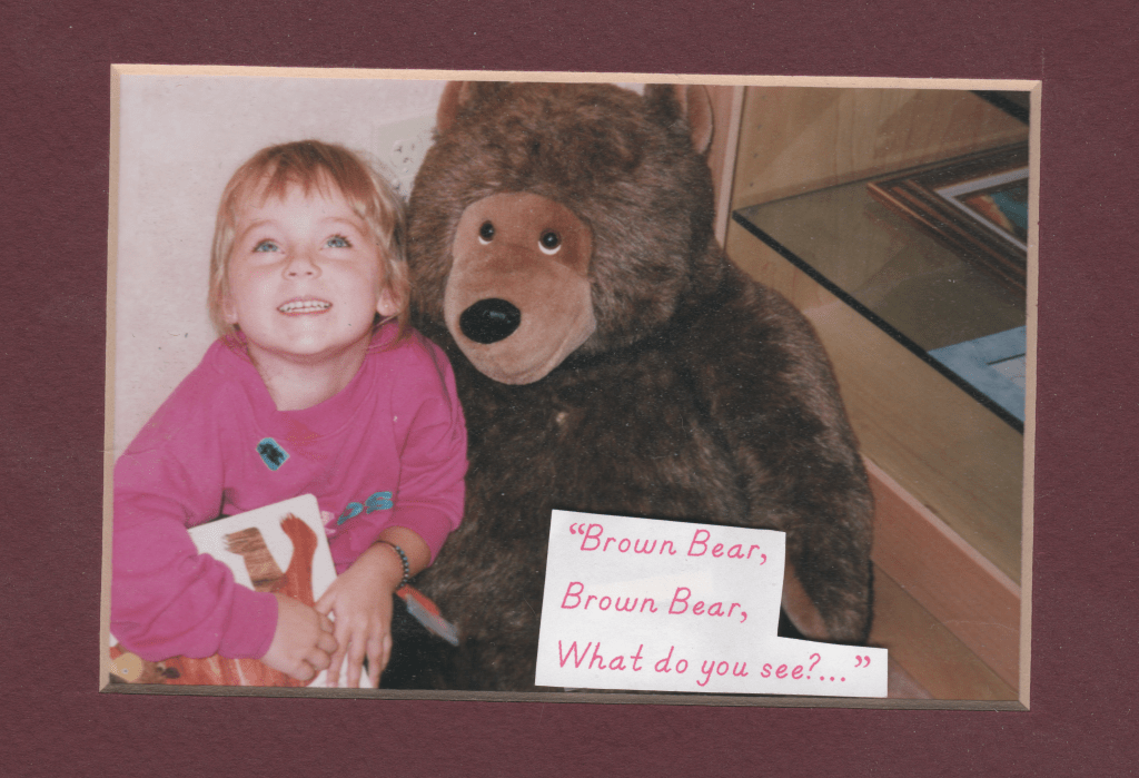 At a stop in Great Falls, where we walked in the footsteps of Sakakawea, we enjoyed the Lewis and Clark Interpretive Center where Allison found the gift shop before we did. She’d cozied up to a giant brown bear reading a book off the shelf: Brown Bear, Brown Bear. Her mother found her and looked at me, “My gosh– she’s reading!” At three years old, with a repetitive and predictive book, yes, she could read! It was a picture perfect moment: