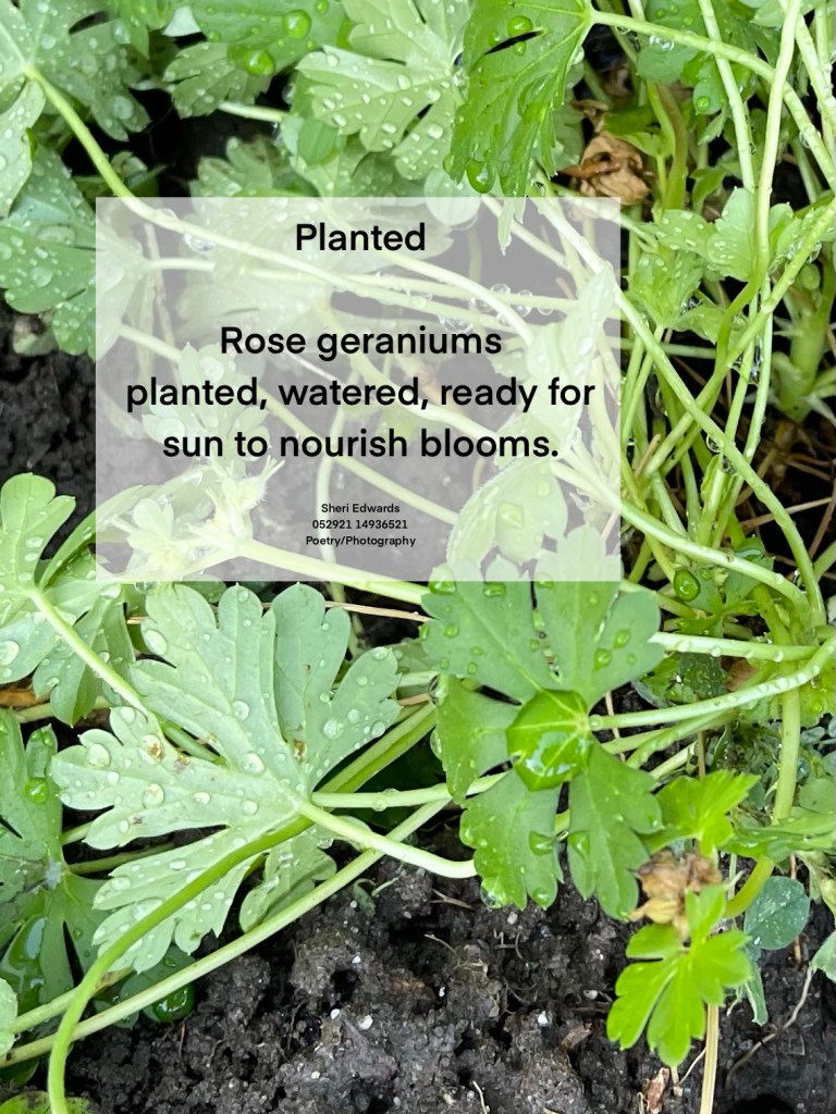 Every day, a photograph, a poem. I finally planted my geraniums by the side of the house where they will receive early morning and afternoon sun with quite a bit of shade. I’m glad because that side of the house lost its flowers over the years; now we will have spring and summer blooms. I wanted them in the front yard, but I could not dig into that soil– so many roots from the rose bush. I think I may like them here better, where they will show off and spread on their own.
