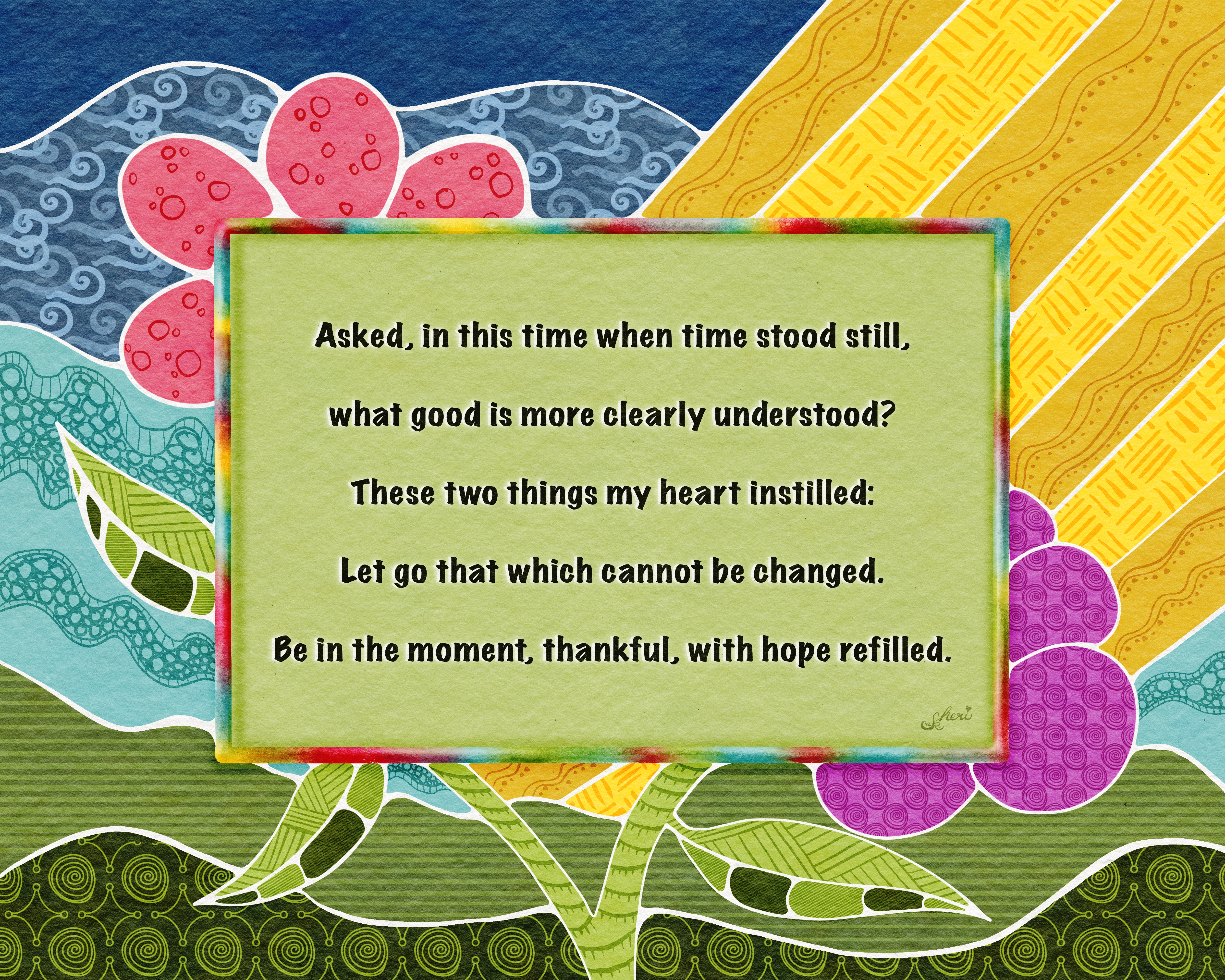 My poem is about relieving stress by know what can be changed and by appreciating the now each moment. Yes, we know this, but during this difficult time, that is also what keeps my heart pumping towards hope each moment.