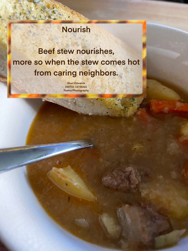 Every day, a photograph, a poem. Today we return home from our first road trip after 449 days of staying home. And when we returned home, our neighbors not only had retrieved our packages, but also returned them to us with warm beef stew and garlic bread. Such a great neighborhood, which we appreciate daily.