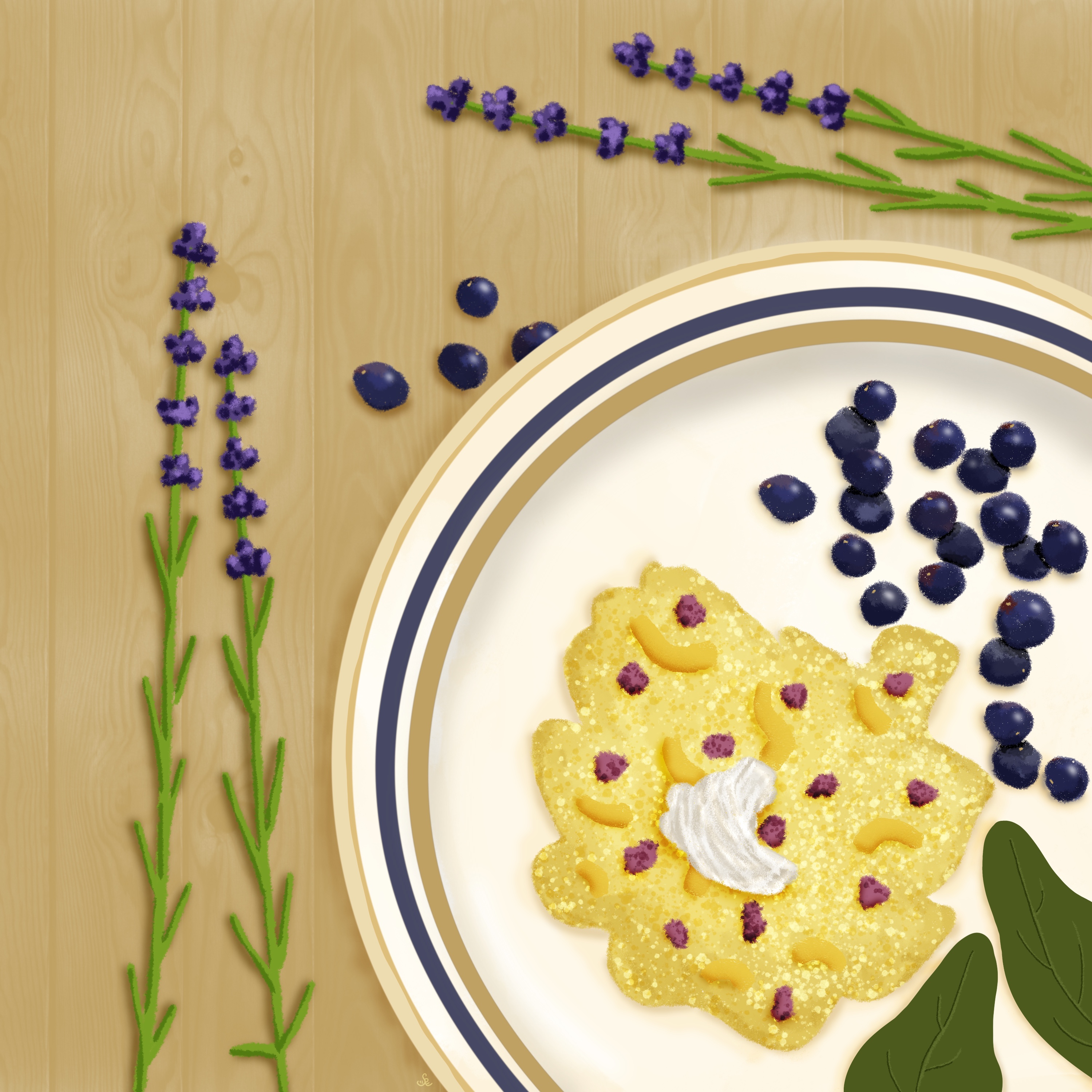 Today the prompt is on my table, so here’s my breakfast! It’s scrambled eggs with cheese and summer sausage with a dollop of cream cheese, a bit of spinach, and blueberries. Of course, a few spilled besides the lavender from the garden.