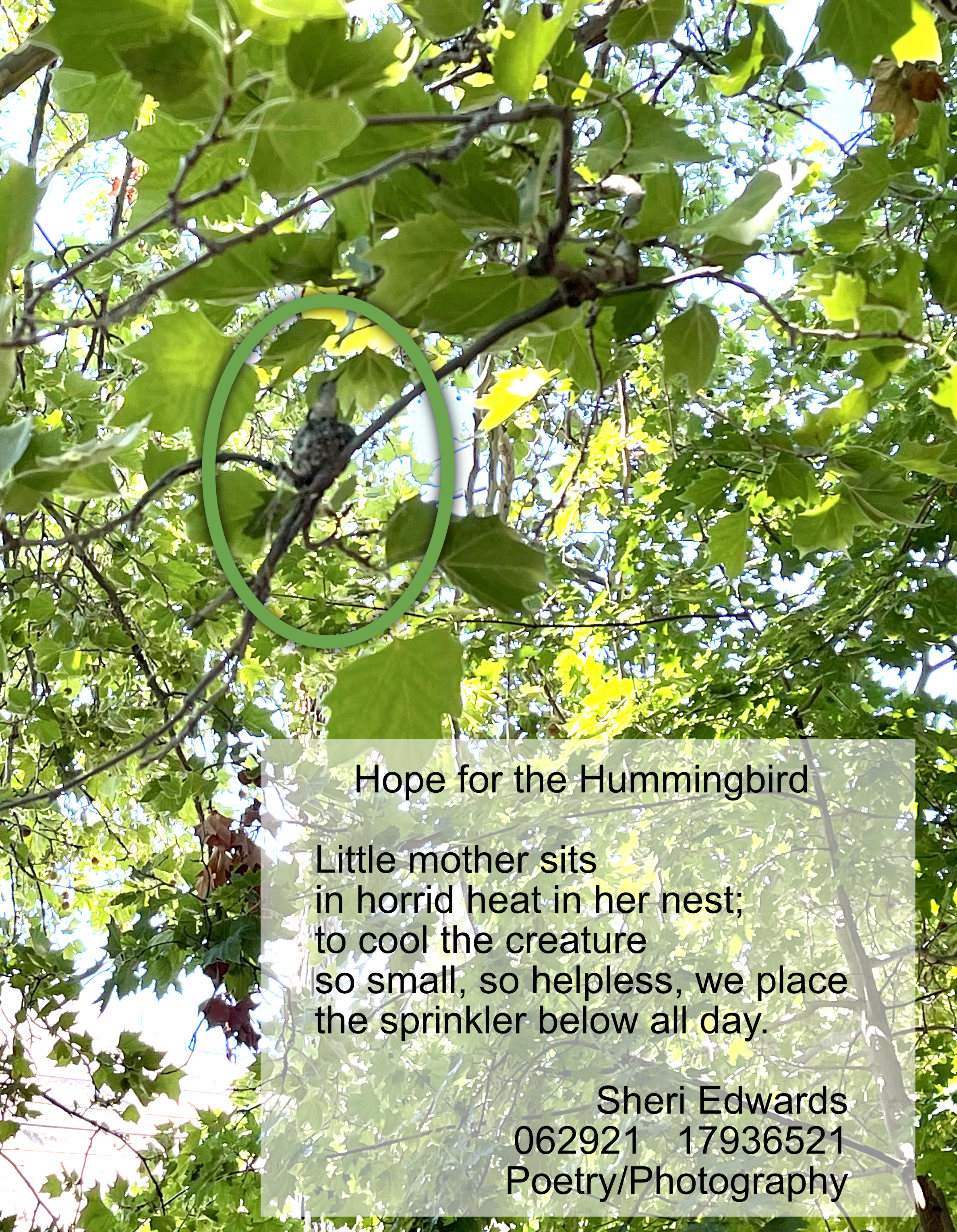Every day, a photograph, a poem. This little hummingbird may not make it in the heat — it is 115 degrees F here. She is in the shade of our sycamore, and we have water in a bird bath and with the sprinkler beneath her. It’s just so hot for the little creature.