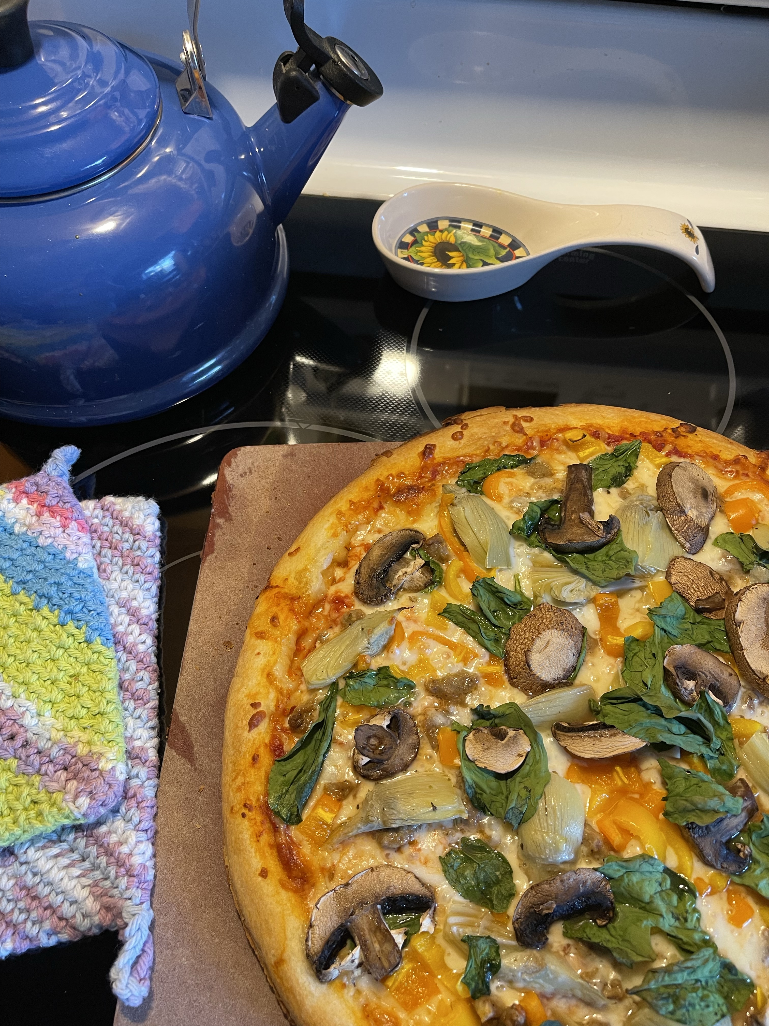 One of my favorite foods for which I just happened to to snap a pic—Pizza: sausage, artichoke hearts, spinach, peppers, mushrooms, black olives [not on this one].