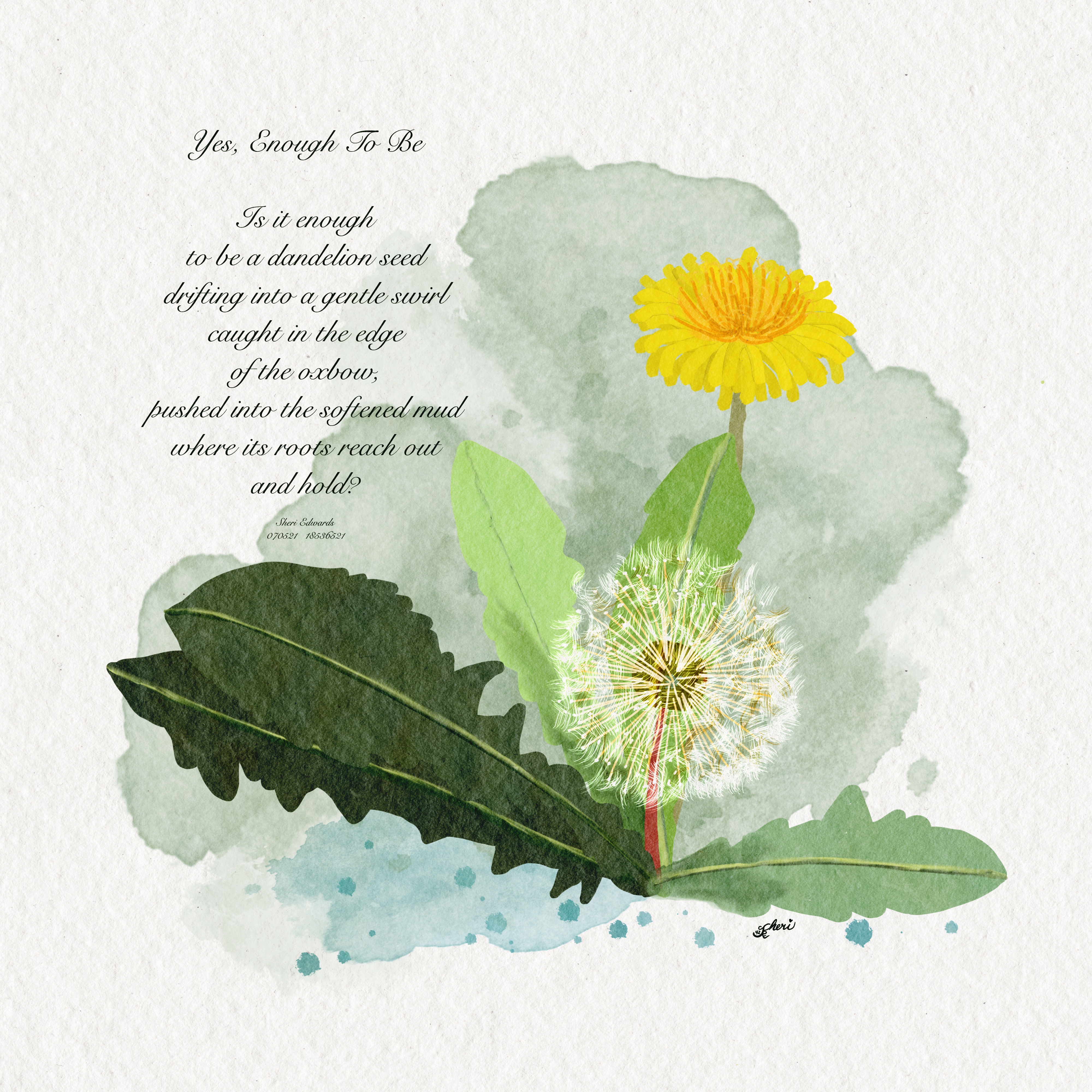 I thought, in response to Terry’s query, that it is enough to be a dandelion seed drifting into a gentle swirl caught in the edge of the oxbow, pushed into the softened mud where its roots reach out and hold, even if no one sees it there in the woods.