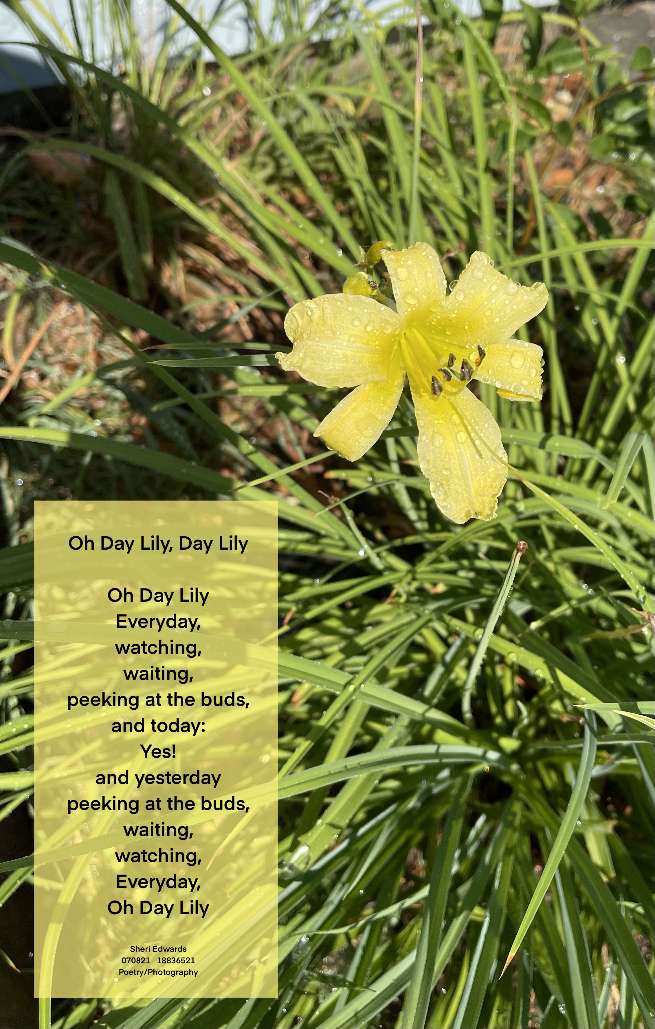 Every day, a photograph, a poem. Yellow is a color that shines– a yellow flower, whether daisy, dandelion, marigold, or lily just brightens the heart. So these lovely lilies are a delight in my summers, with their blades of soft green forming a frame around the lush velvet of the yellow petals. I watch daily for each bud to bloom.