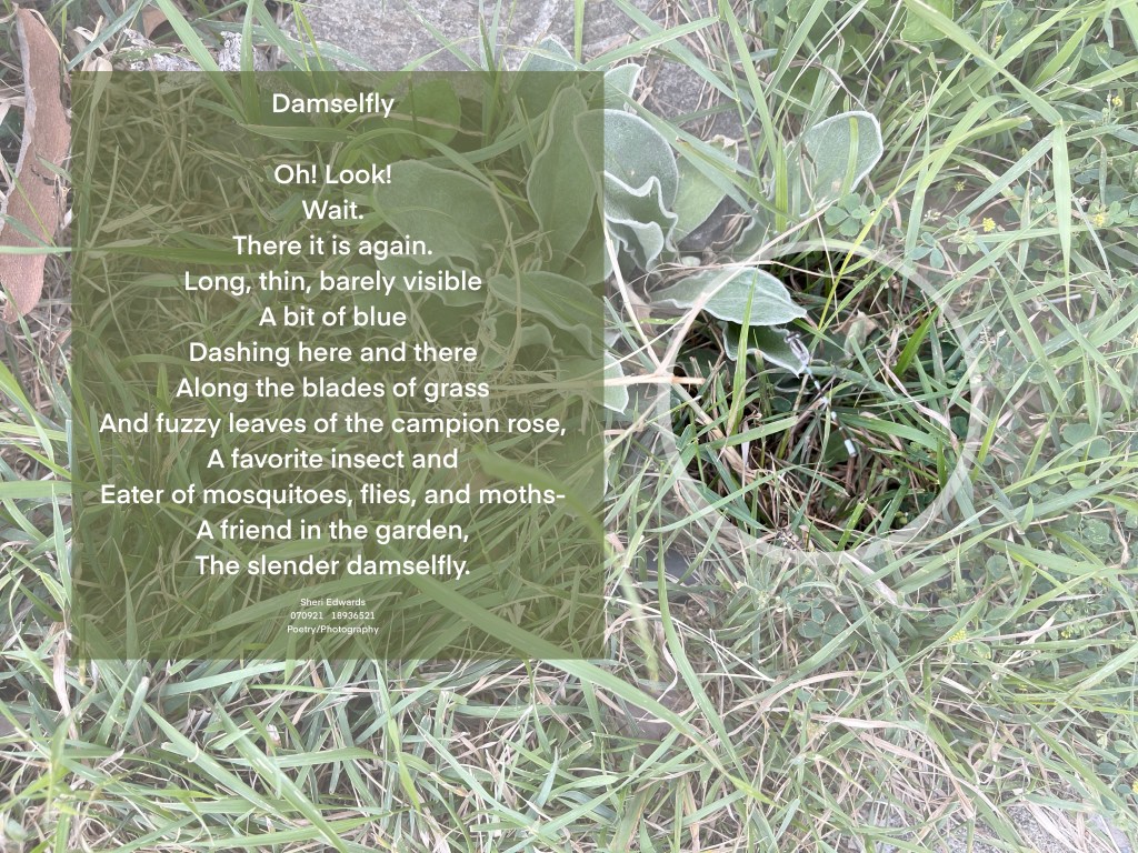 Every day, a photograph, a poem. I wasn’t sure what I’d find today in the yard, but guess what? A little blessing arrived to brighten my day. I love dragonflies and damselflies because they eat those pesky insects like flies and mosquitoes– they are very beneficial to the garden. So how lovely to have one visit along with the swallowtail butterfly whose also been visiting.
