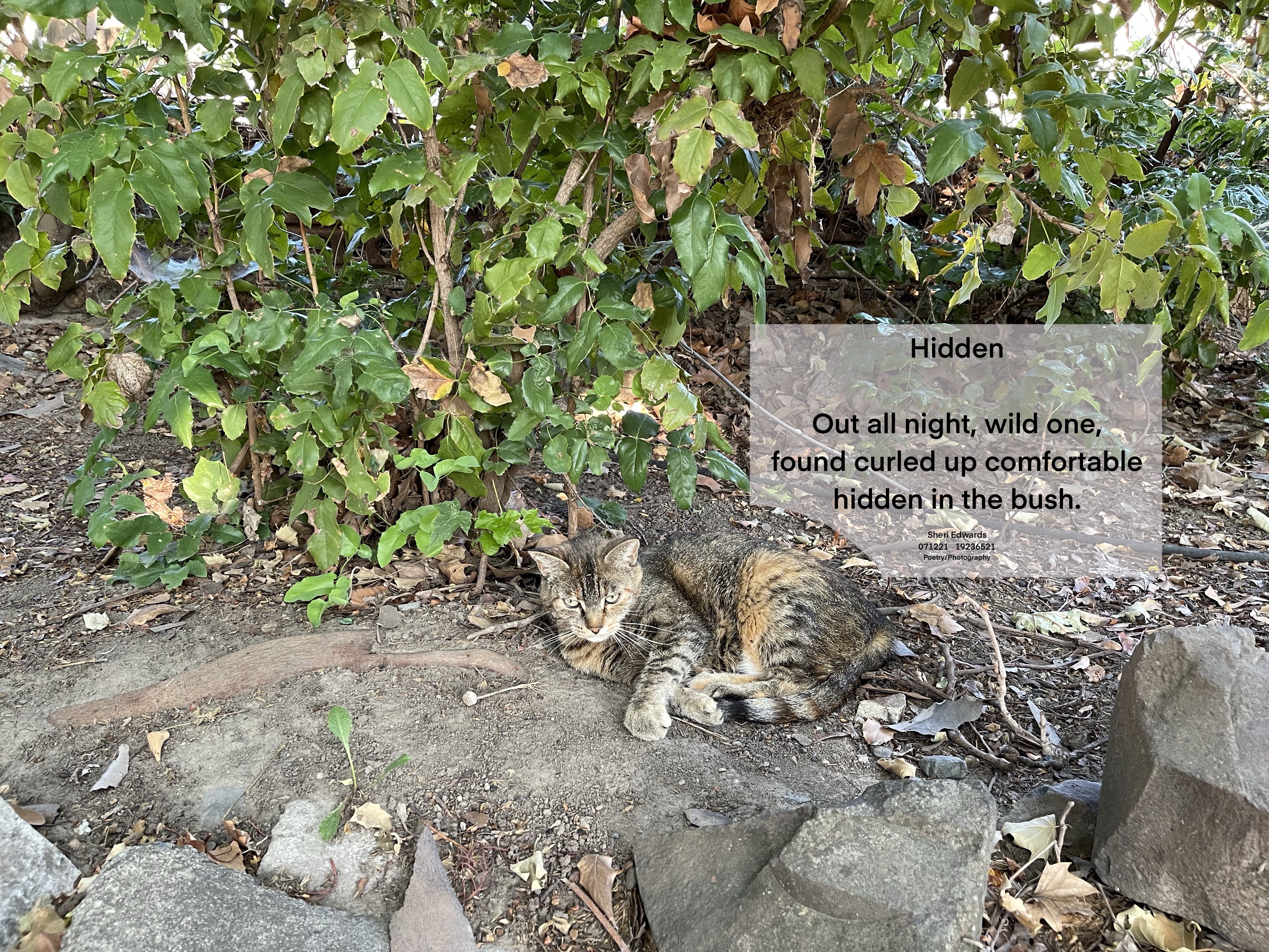Every day, a photograph, a poem. Yes, the wild one stayed out all night, even with a raccoon sauntering through the yard. Itty the Kitty stays hidden, camouflaged in the brown and yellows. I stepped out this morning to find her, and there she was, all curled up in her spot– sometimes she lays further back beneath the Oregon grape, especially if the neighbor’s dogs are barking or perhaps the deer come to trim our trees. You can see how comfortable she is– her left paw reaching out, “gooshing,” like a content cat.
