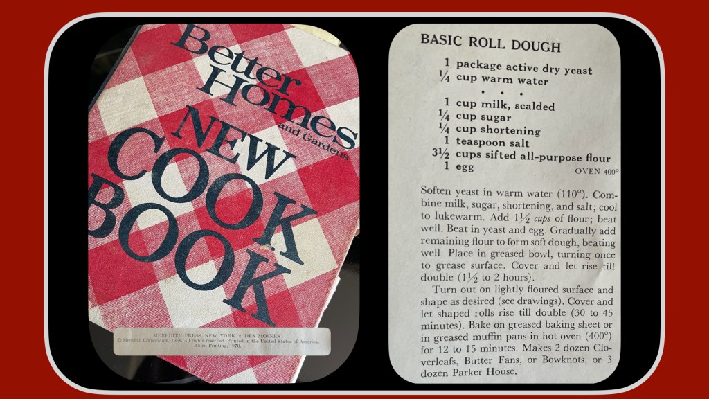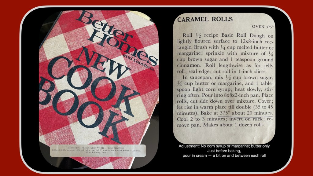 But– to save the day is my 1970 Better Homes and Garden NEW Cookbook, recipes I know I used. Here are several related to breads and cinnamon rolls, including an adaptation that my mom would have made [always butter; add cream].