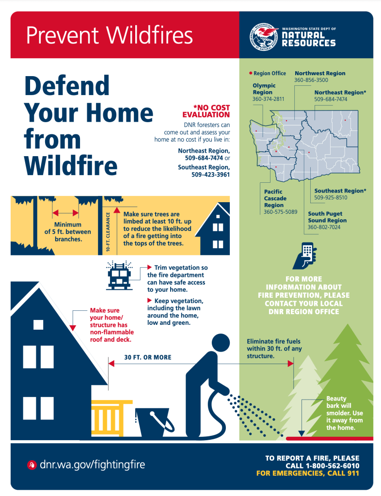 Here’s an entire website of information on preventing wildfires: Washington State Department of Natural Resources, including this one on defending your home [click image for pdf]: