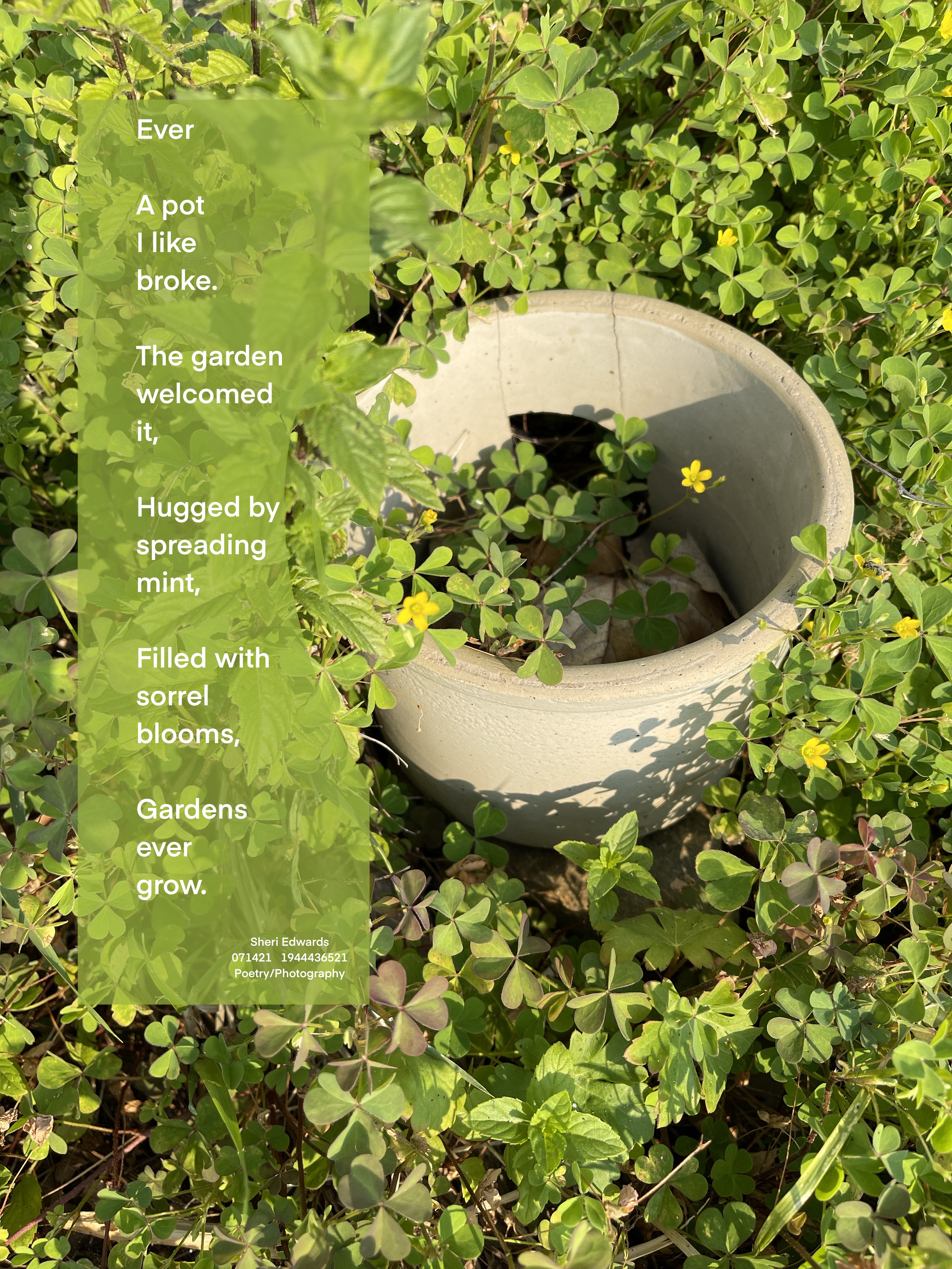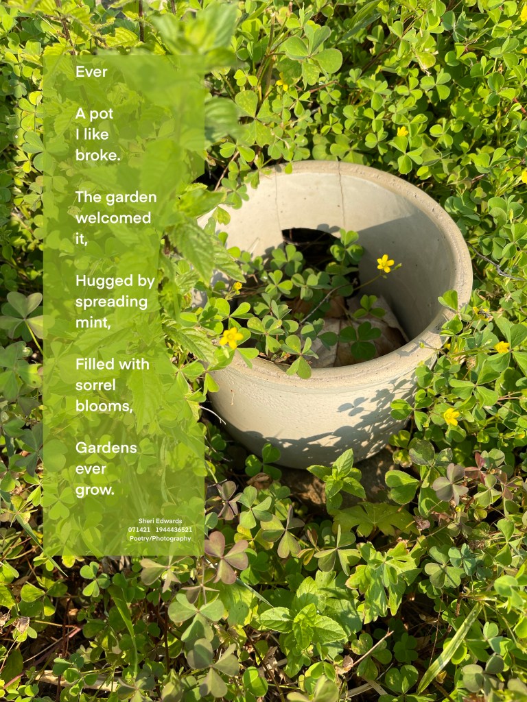 Every day, a photograph, a poem. Yes, the pot broke, and I set it down in the garden in a dusty spot, a bit of interest and a sad note for the pot. Yet, there it sits, the garden growing around it, including the mint and wood sorrel needed for the bees. I love the play of greens, reds, browns, yellow and the sorrel shadows, a pleasant moment in a sad day due to wildfires out of control.