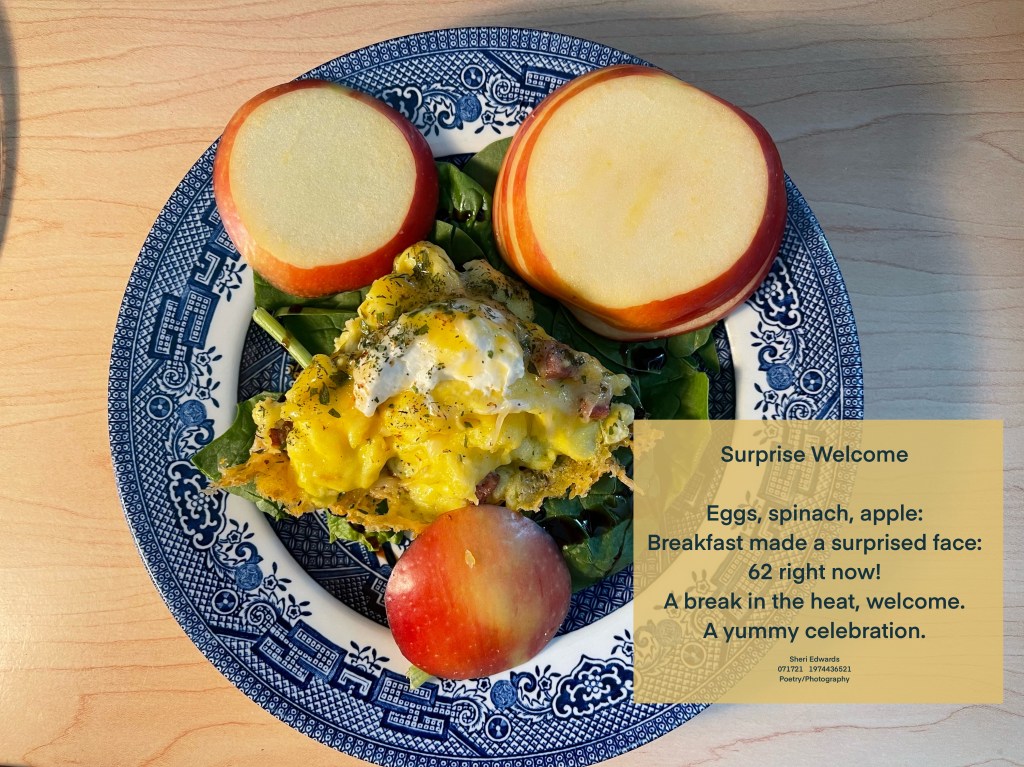Every day, a photograph, a poem. This morning we are pleasantly surprised with cooler weather– only 62°F — just the fan is bringing in the cooler outdoor air. And Scott usually brings breakfast with the dish arranged as a face. Today, it’s a surprised look due to this pleasant change in our weather.