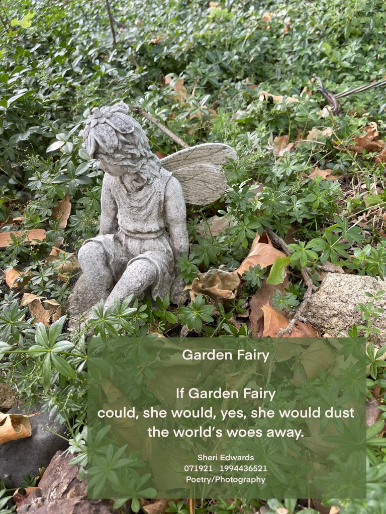 When I stepped out my back door onto the porch, this little fairy sits and listens, and I know, if she could, she would fly around the world sprinkling her dust with a little nudge to get along, to find solutions, to be kind, to listen. Sigh.
