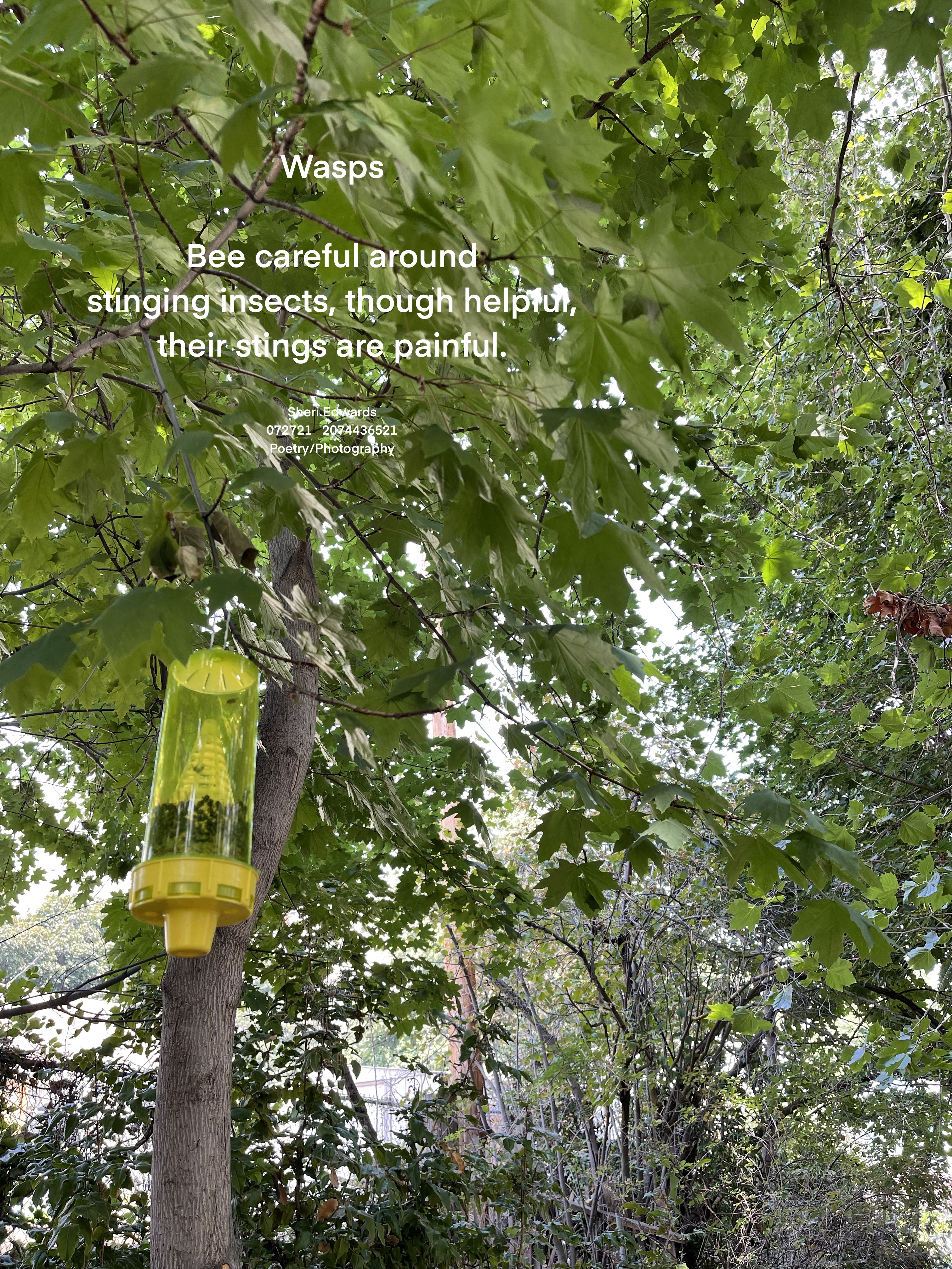Every day, a photograph, a poem. This morning, I walked around a little track I’ve created in our yard, just to get a bit of exercise on smokey or hot days. We love the canopy of our backyard and have a cute little table and chairs on the back porch so we can eat meals there, but oftentimes that is not possible when the wasps are out and about. They eventually sense the food and come to feast. If we put up these wasp catchers, it really helps.