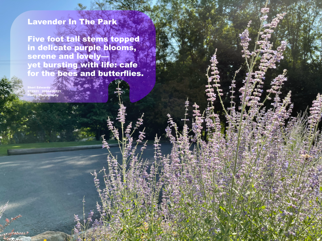 We walk across the foot bridge to the memorial to the first mayor for whom the park is named, then turn left up around the once-filled-with-kids-swimming-but-now-filled-with-sand pool, and as we turned the corner on the far side, there– beyond the water droplets sparkling in the freshly watered lawn [thanks to our excellent park manager]– gently waved the stems of tall lavender, shining in the sunlight, a beautiful sight teeming with life, I’m sure you’ll agree: