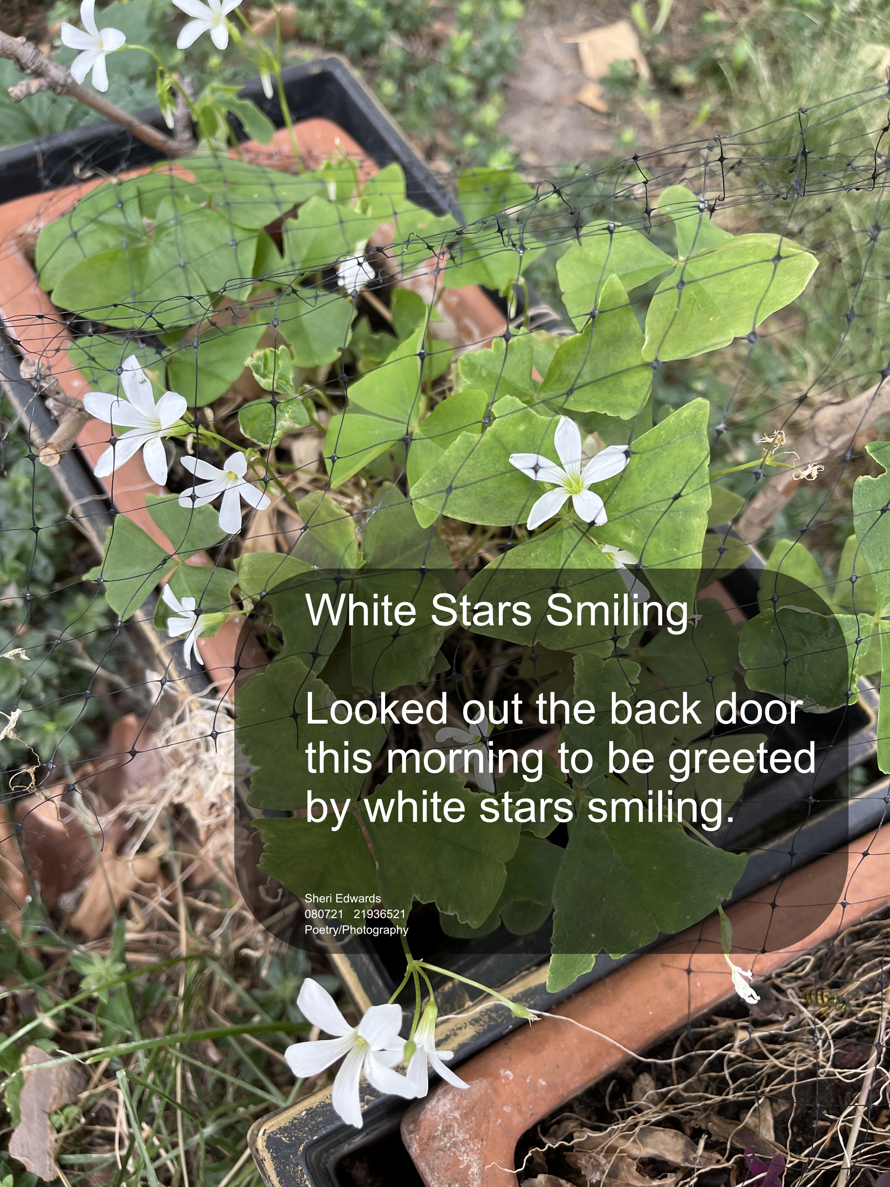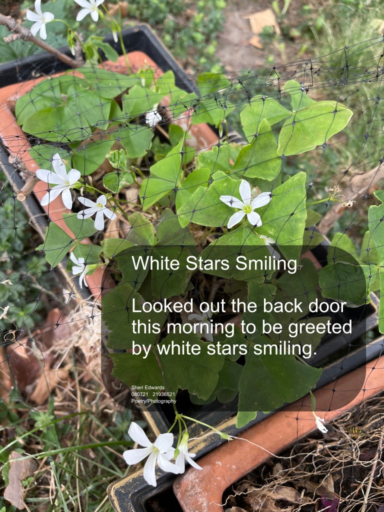 Every day, a photograph, a poem. Walking into the kitchen this morning, I glanced outside through the open slider and found several white stars smiling back at me– protected from deer with netting. Happy Day: clear skies, cool weather.