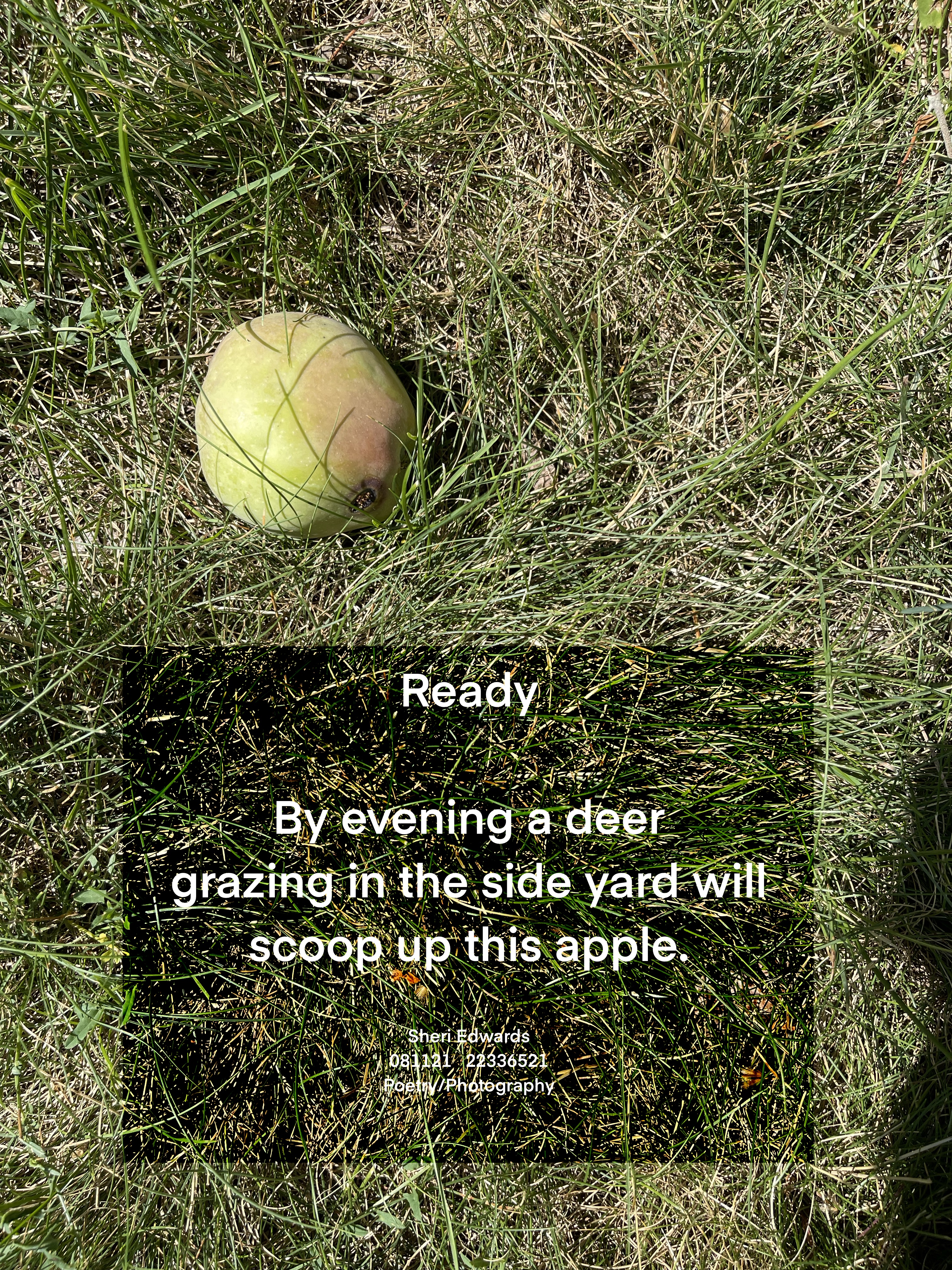 Every day, a photograph, a poem. A walk through the yard today in 100° F heat and somewhat smokey air found me staring at this apple, fallen and ready to eat, complete with bird peckings and worms. 🙂