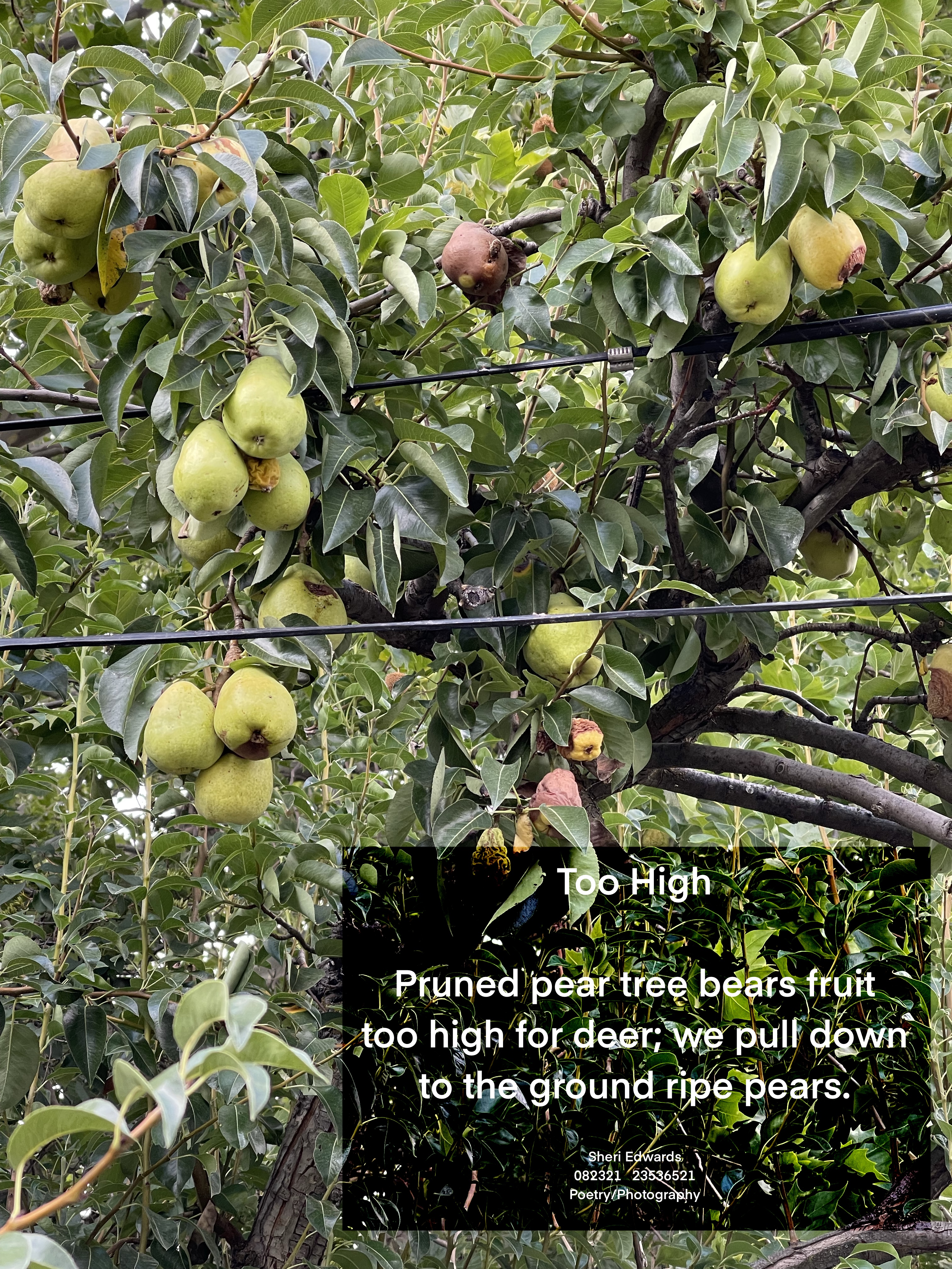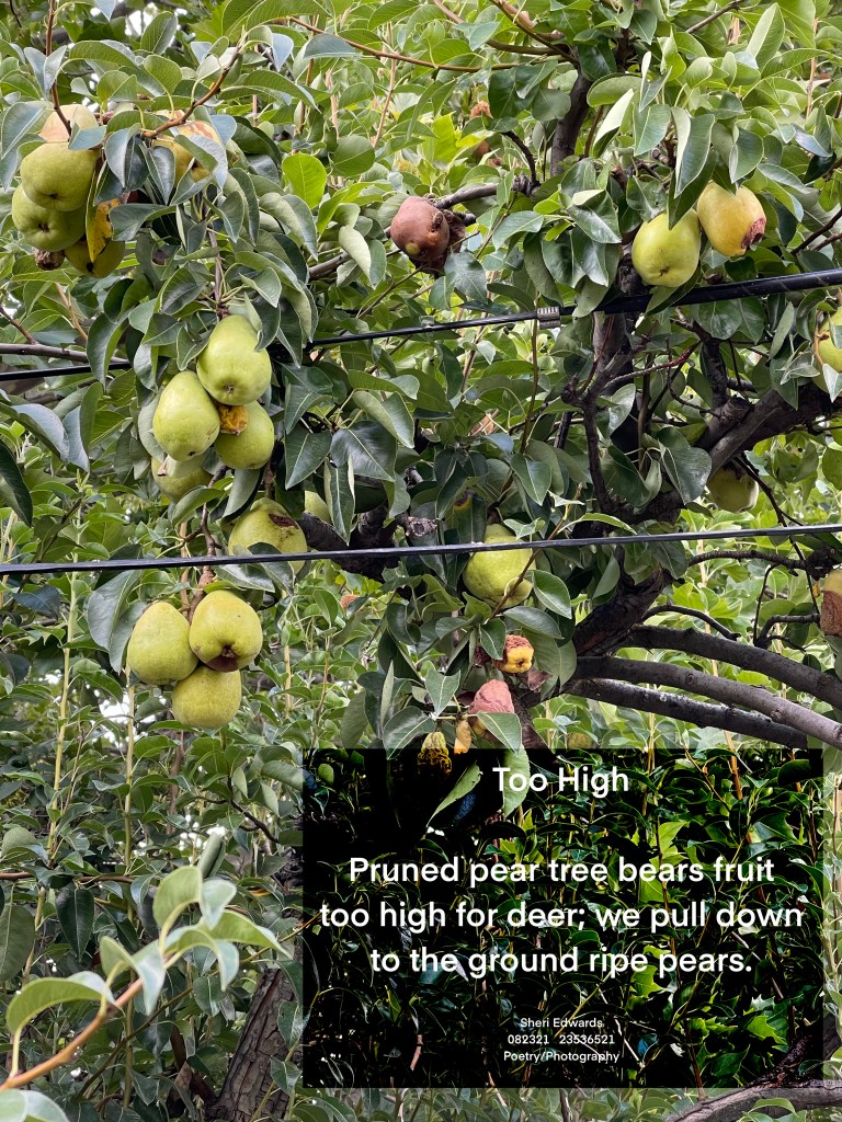 Every day, a photograph, a poem. Today I noticed that since we pruned our pear tree back to nothing, the pears are too high for the deer. We’ll need to pull them down!