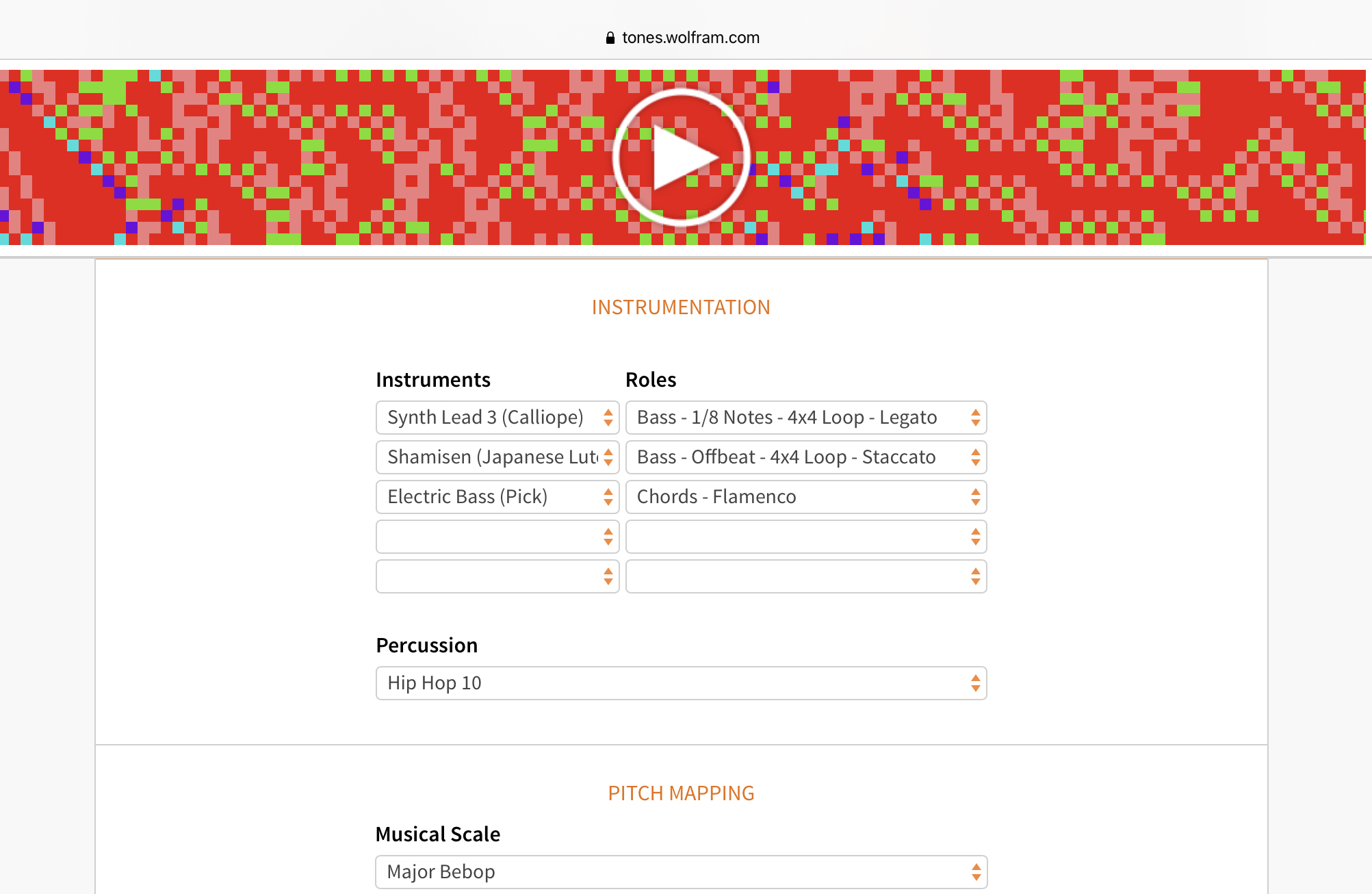 So I created the strange music here at Wolfram Tones and added it in a video with my art– something fishy. Screen of my choices of instrumentation:
