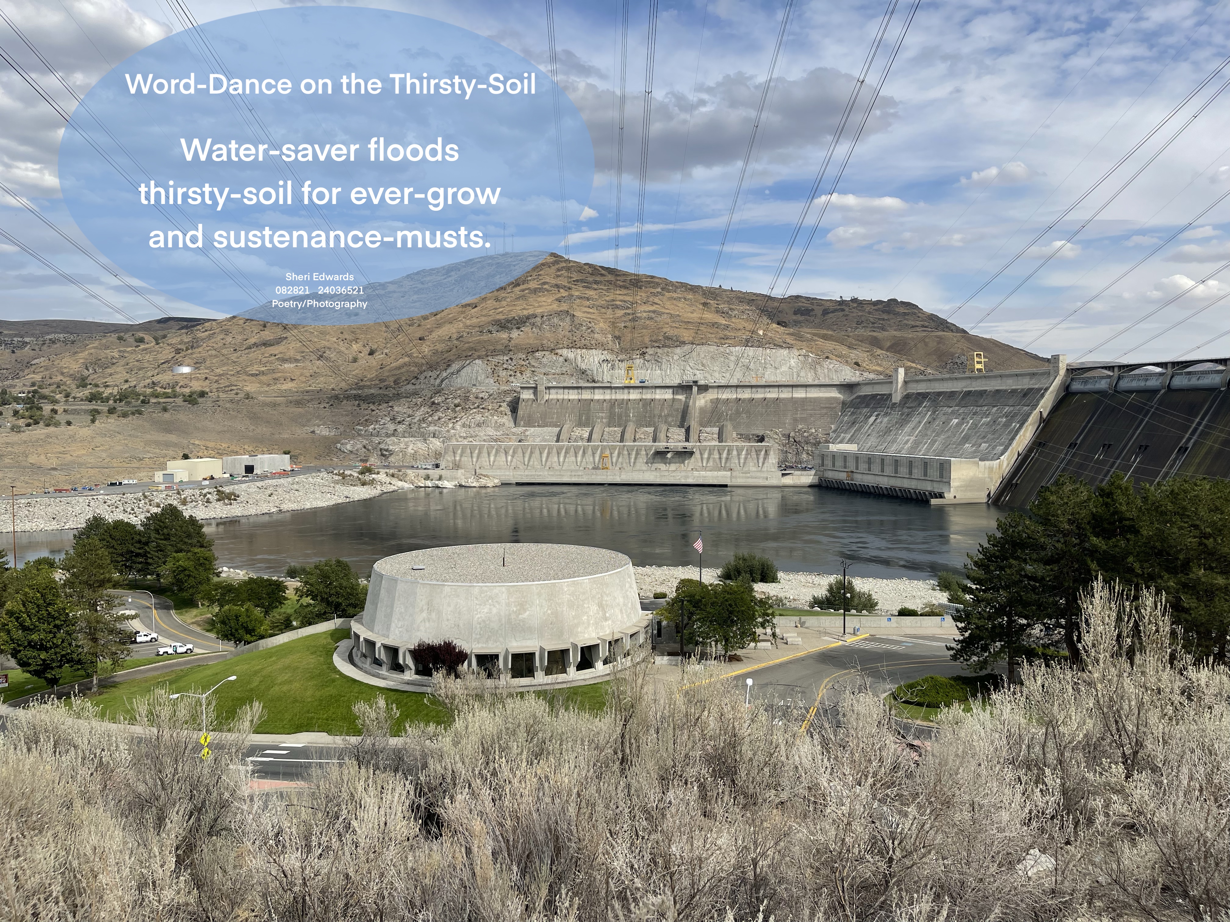 So my photograph today was taken up the hill behind city hall looking east towards the Grand Coulee Dam, reservoir that irrigates the desert, giving it life to grow our foods. You will recognize, I hope, the nouns I replaced with kennings: dam, desert, food. And my kenning for a kenning: word-dance.