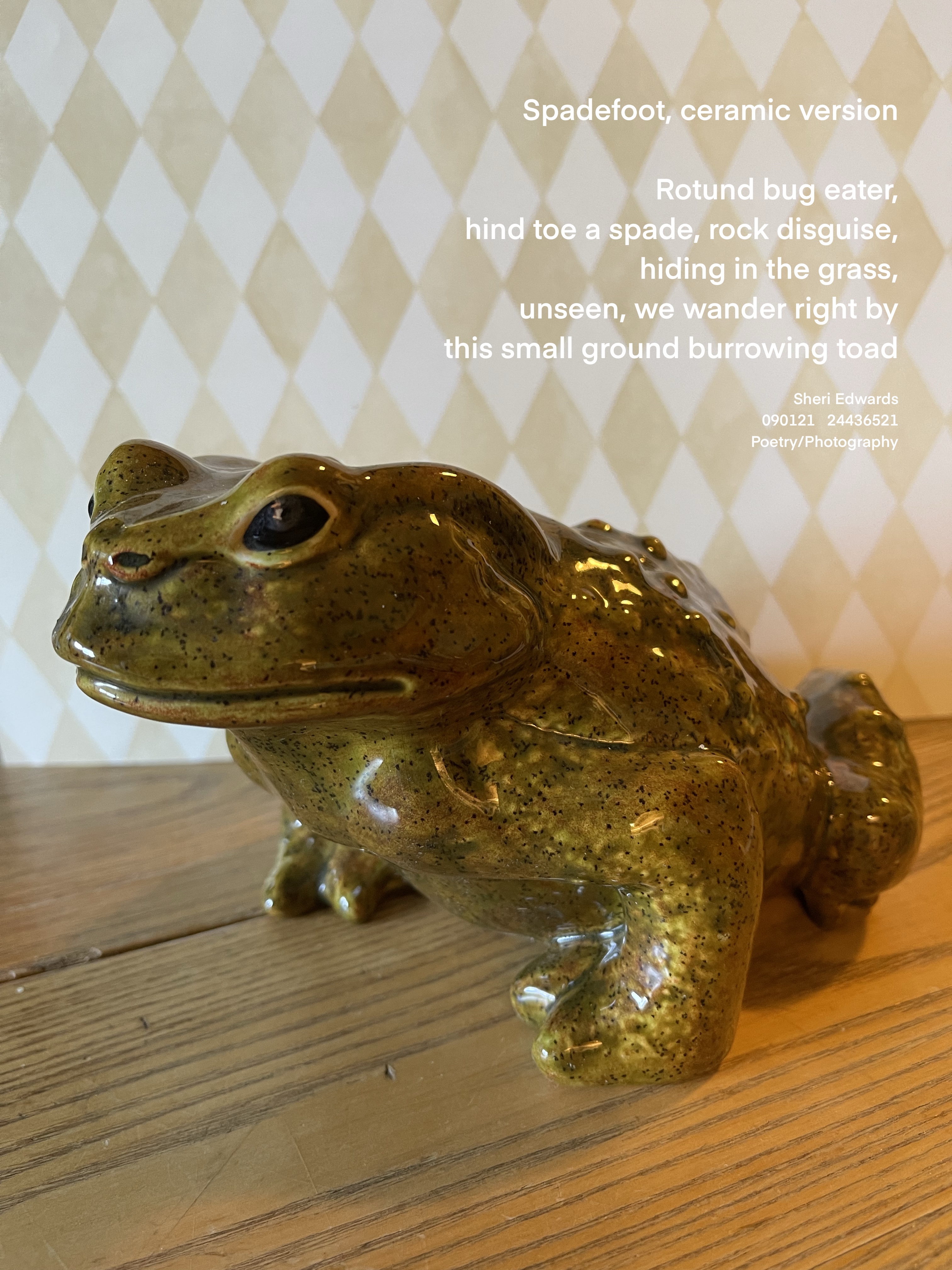Every day, a photograph, a poem. Today’s Daily Create is what an Amazon Echo might look like in something around your house– and I spotted this ceramic toad I made in the 70s. Funny, the silly things we used to create, but I do like toads– I think they are fascinating.