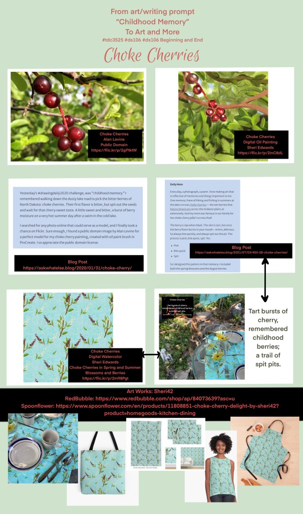 #tdc3525 #ds106 #ds106 Beginning and End–so I created a beginning artist’s journey over the course of 1.5 years of writing and art on “choke cherries, a childhood memory” — the beginning to the end, so far in this clickable Google Slide: Choke Cherries: