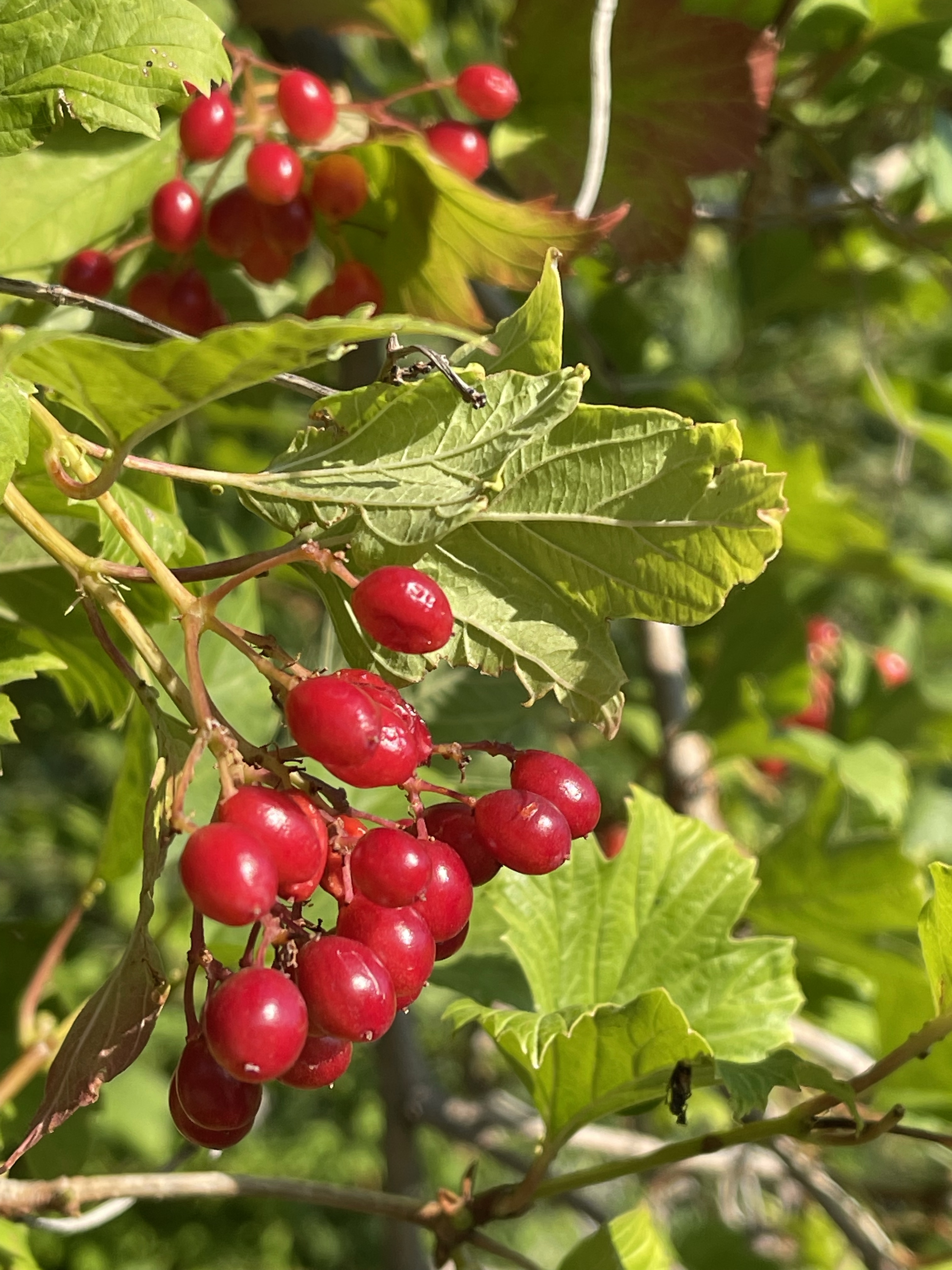 We also found American Cranberry Bush— a small tree, really. You might try to eat them, but may cause stomach upset. Read more here: American Cranberry