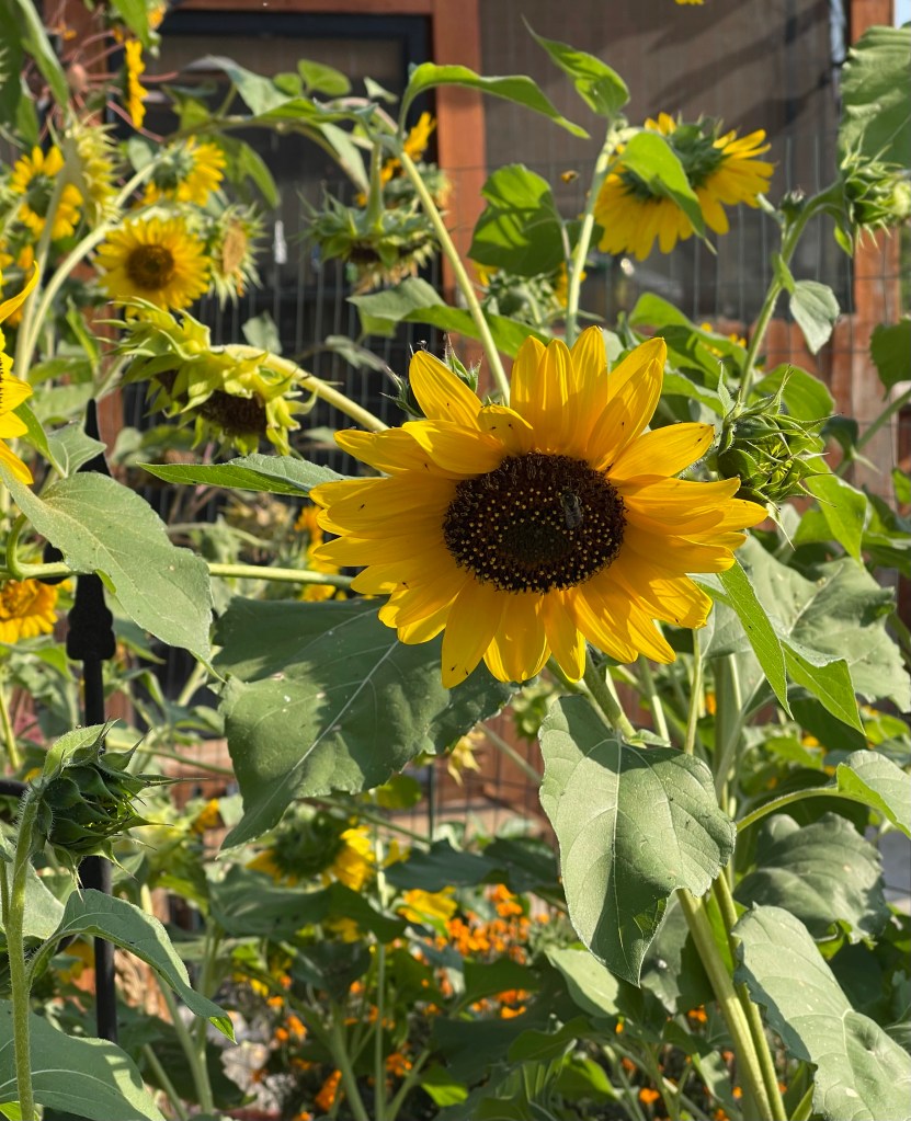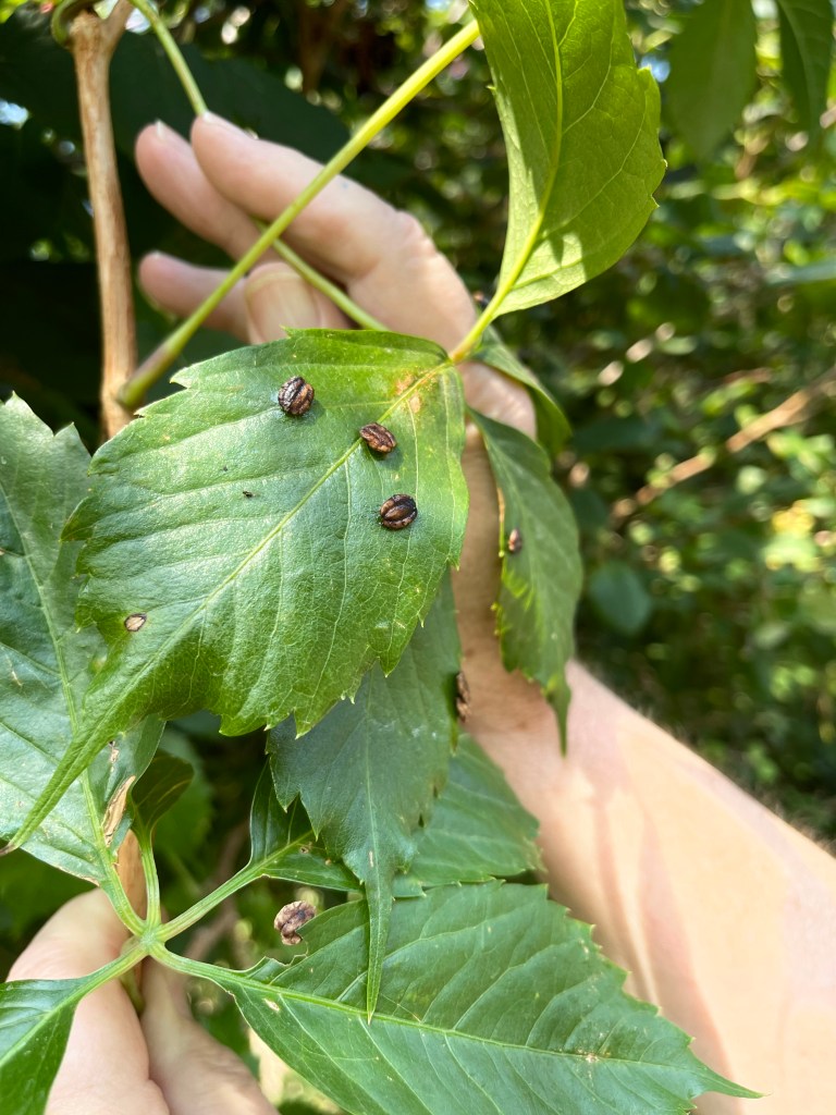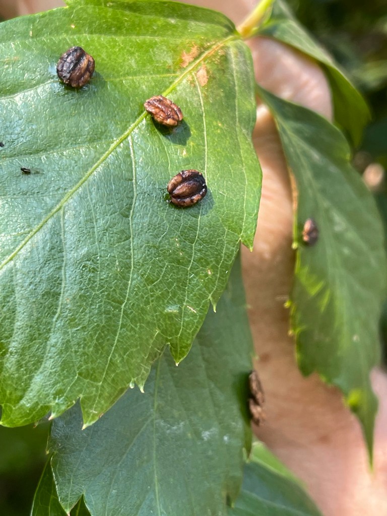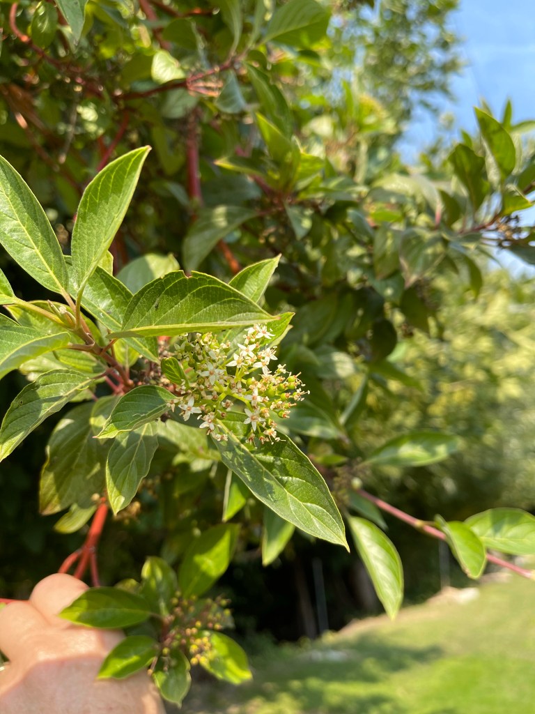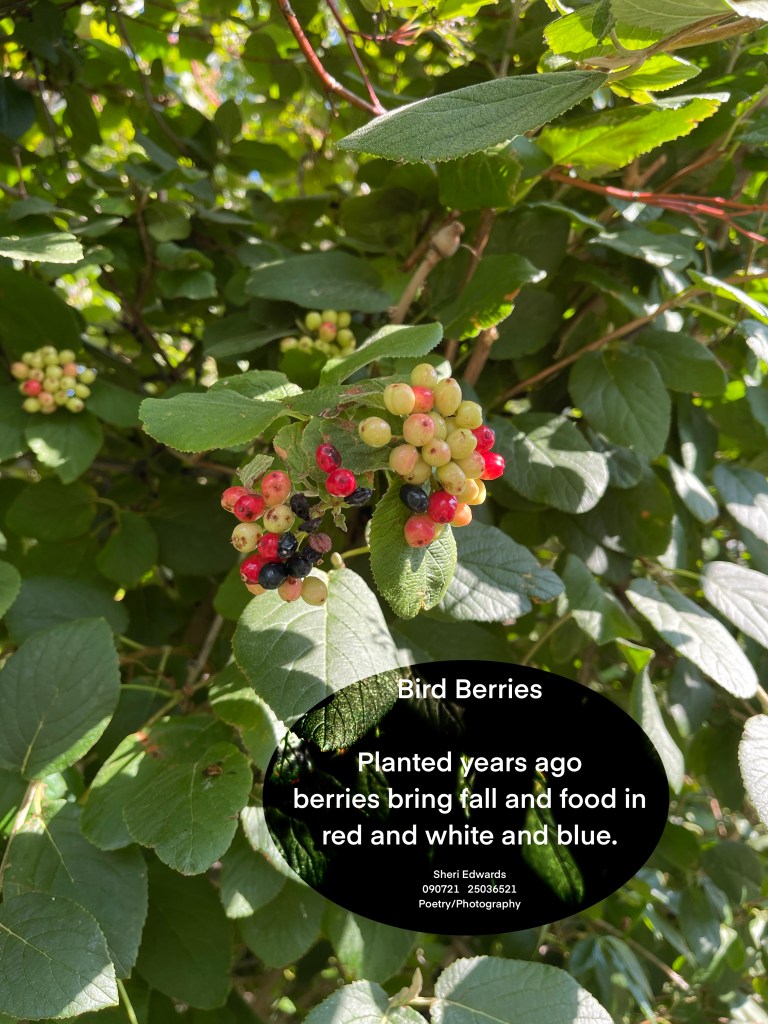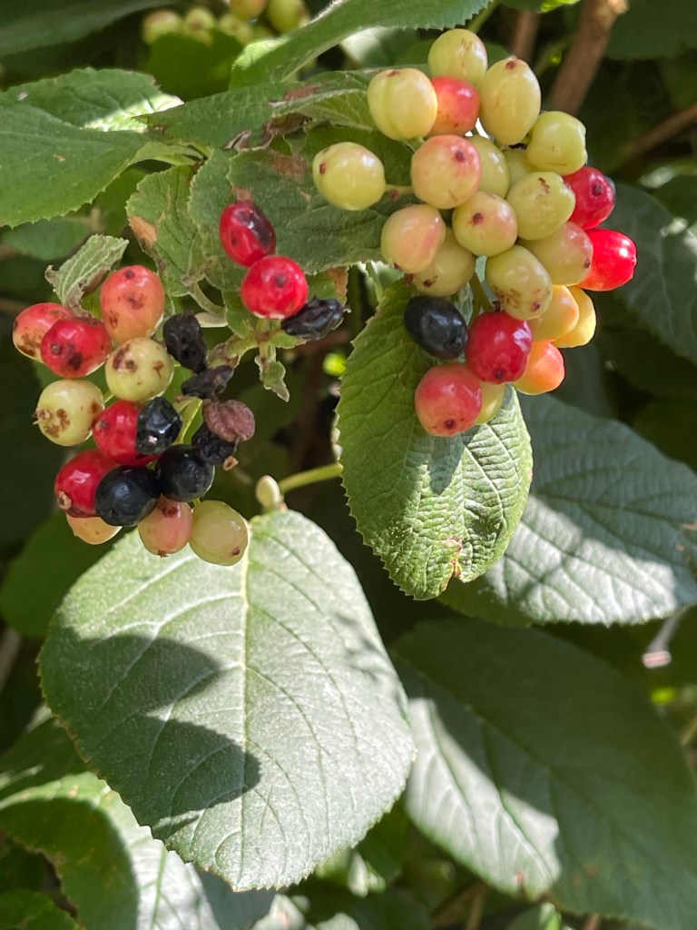 Above you see Wayfaring Viburnum — plant birds love, and I love that these berries are red, white, and blue at different stages of ripeness. They are poisonous to humans.