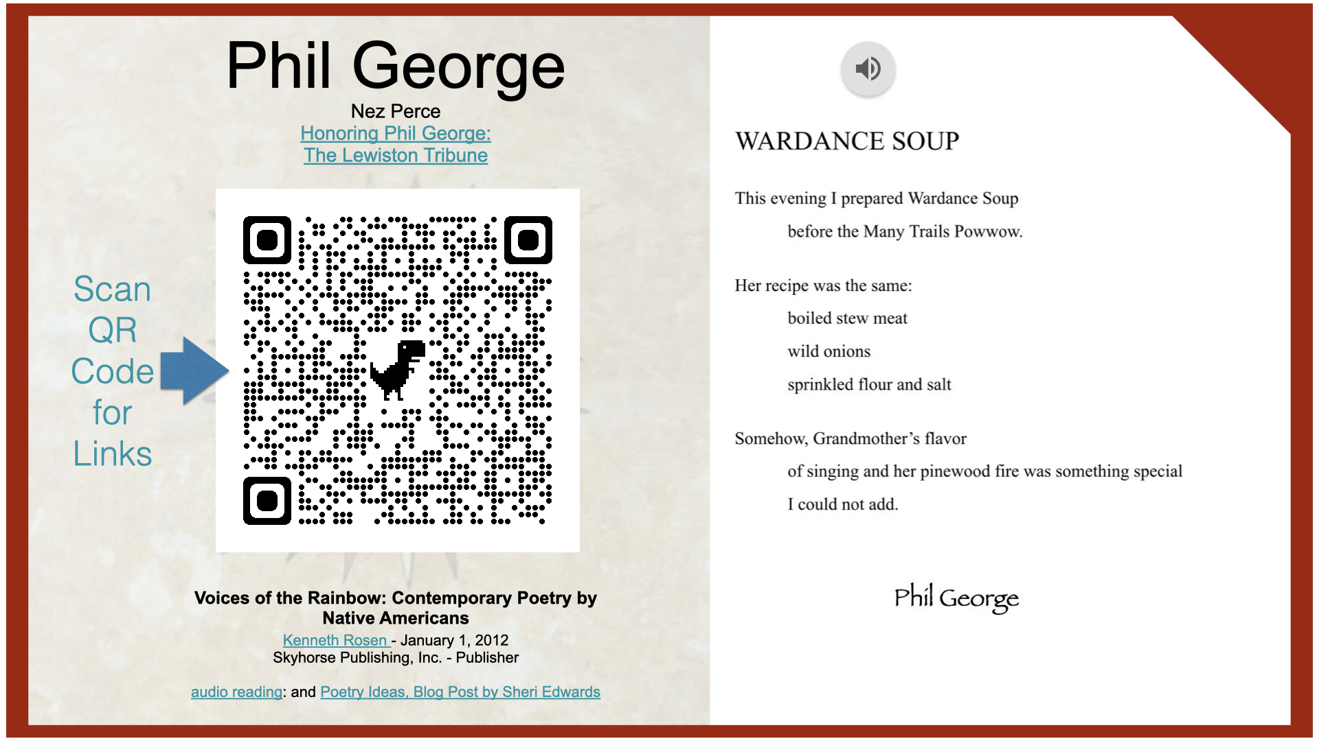 I chose my favorite poem, Wardance Soup by Nez Perce poet Phil George. It’s heartfelt memory of an elder through continuing a traditional custom of making wardance soup reminds us of that we can remember and that which is only a memory.