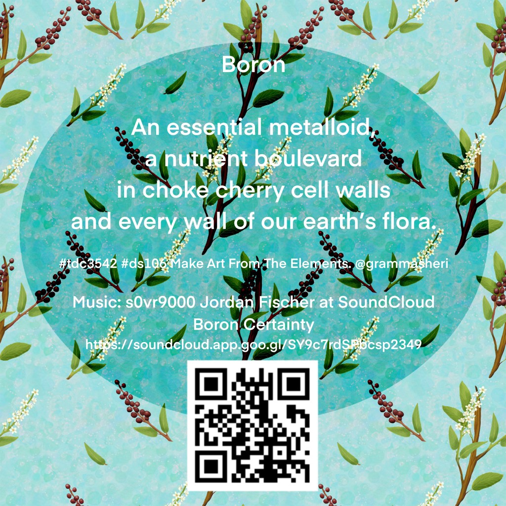 So I created a poem [above] based on boron, built it into a movie with the soundtrack from my grandson Jordan Fischer’s SoundCloud composition, “Boron Certainty.”