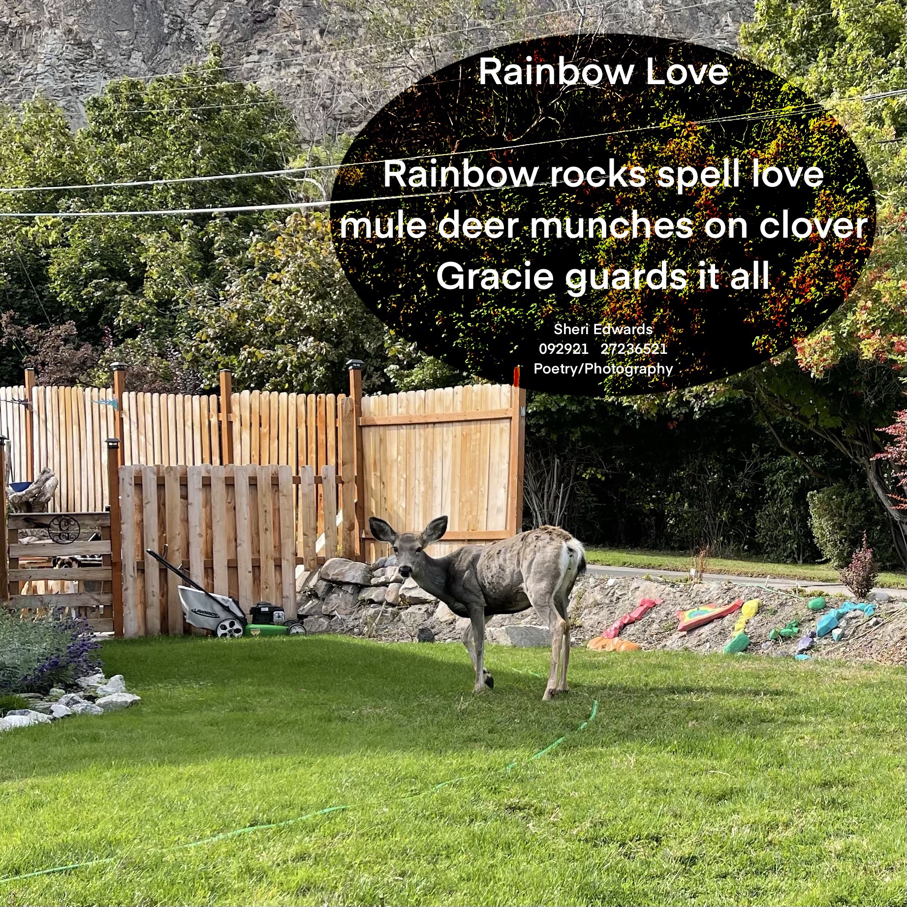 Every day, a photograph, a poem. Lots of pictures from my walk today, but this one is special. I love this yard with its Rainbow Love Rocks, and today the mule deer munched on the clover in the lawn while Gracie kept her eyes on the deer and me. I bet you can’t find Gracie… she’s peeking…
