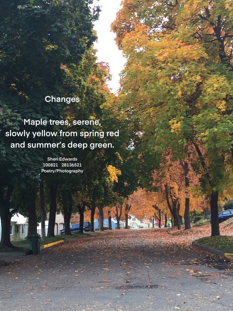 Every day, a photograph, a poem. Look at the lovely maples on the street west of us, just a block up. So lovely, these red maples start in the spring a crimson red, deepen to a forest green, and play orange and yellow in the autumn coolness. I love them.