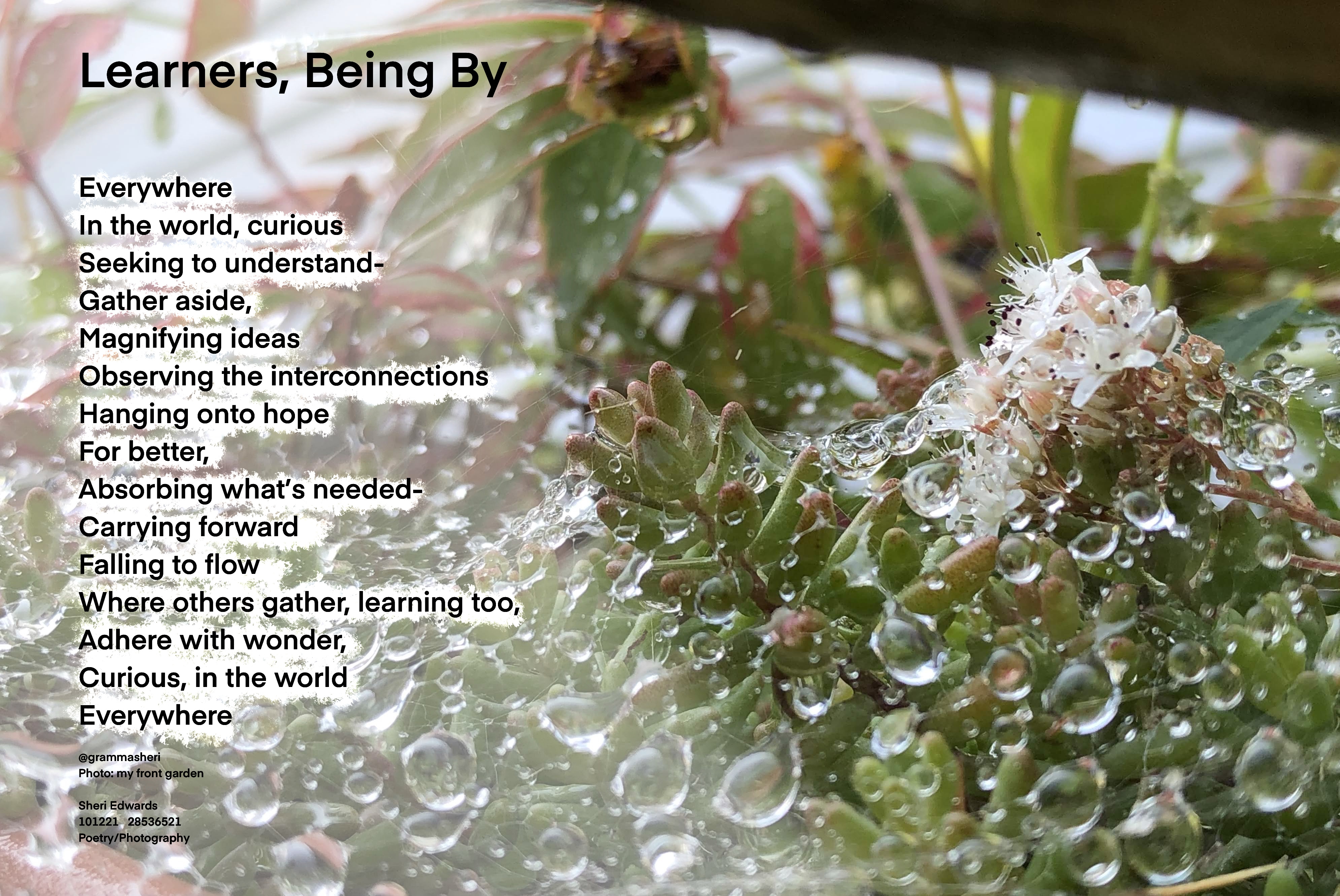 We learners who learn by “being by” are everywhere, and like water, we seek to learn that way. It reminded me of a picture I took in my front garden in 2019 of the drops of water that formed, stuck to the plants, and magnified the parts.