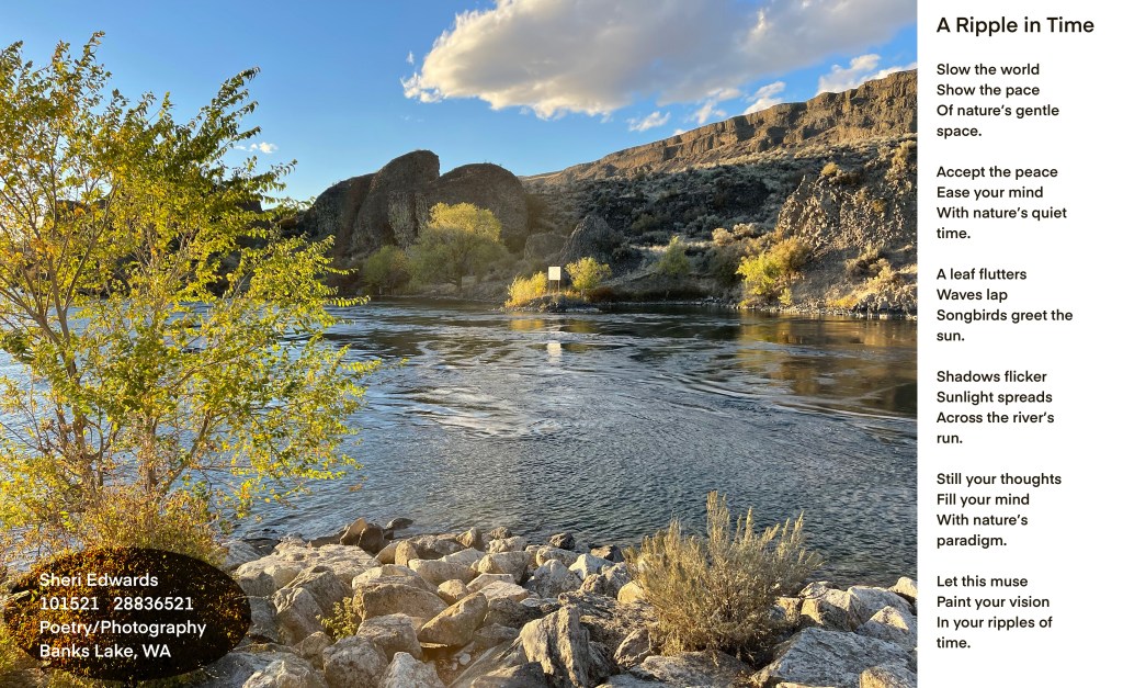 The poem is a place we frequently walk, this spot on Banks Lake near North Dam Park is a favorite area for local dog-walkers and daily walkers. It’s a flat area with scenic and peaceful views especially at dawn and sunset, yet the path can take you up the hills for more of a challenge. Whichever route is taken, it’s a ripple of time that soothes the soul. Hence, the poem for this frequented walkway.