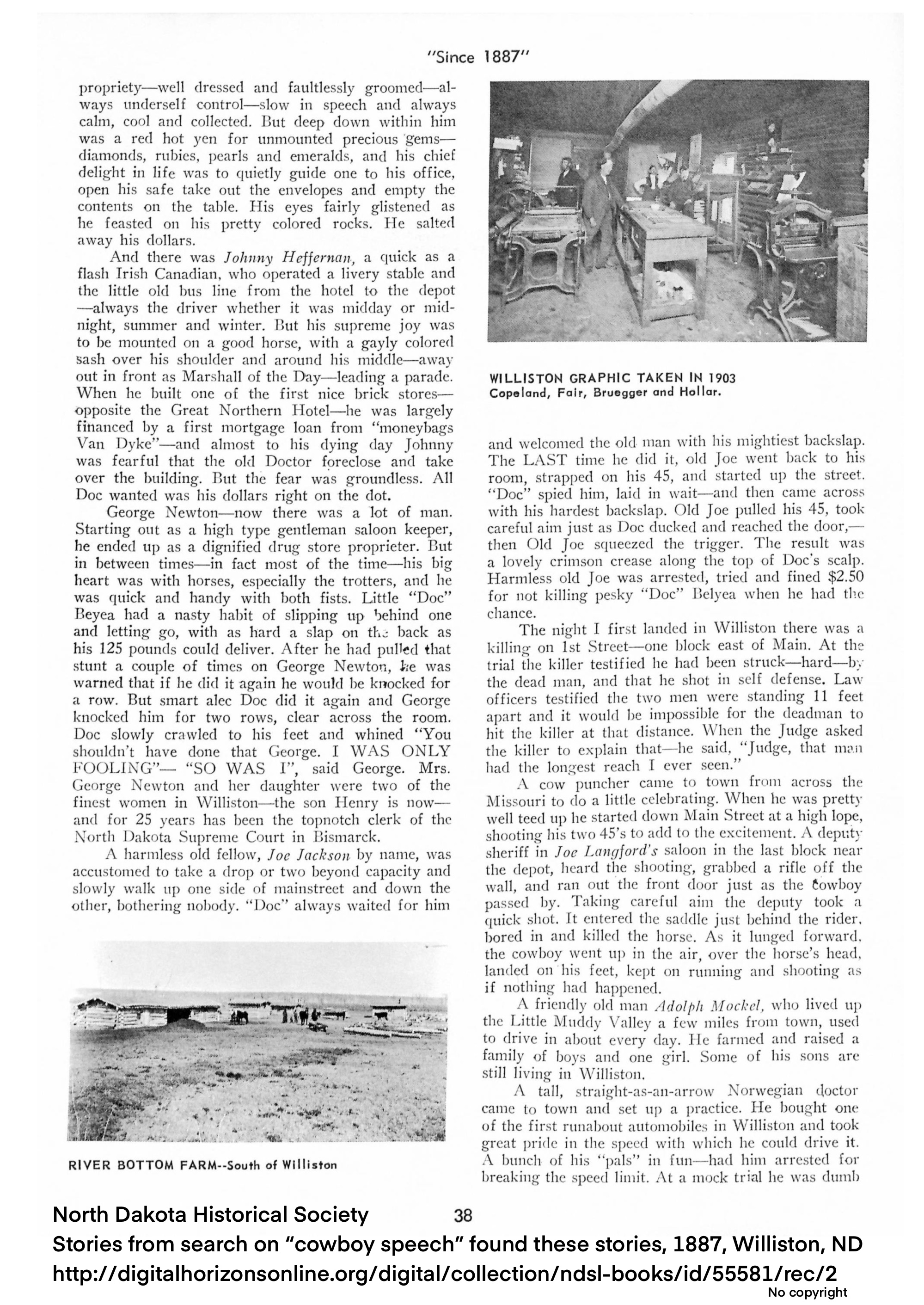 Since the generator didn’t seem to translate well, I did a little research and found some real cowboy talk to translate and some historical cowboy tales… enjoy the postcard translation above from this Flickr Commons image, and these few stories from the North Dakota Historical Society. I did a little stories search on “cowboy speech” and found these stories from 1887, Williston, ND [no copyright]. You many also find this “Cowboy Law” article interesting, also from the NDHS.