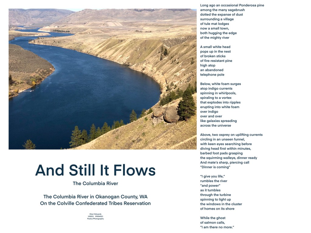 Every day, a photograph, a poem. Winding up the two weeks of #writeout from the National Writing Project / National Park Service two week celebration of parks and the outdoors in the next few days. I choose to peruse my photos for the lovely deep blue of the Columbia River winding its way from Canada to the Pacific Ocean. I wanted it to show its natural winding through the northwest in which the Ice Age had changed its flow, and still it flows.