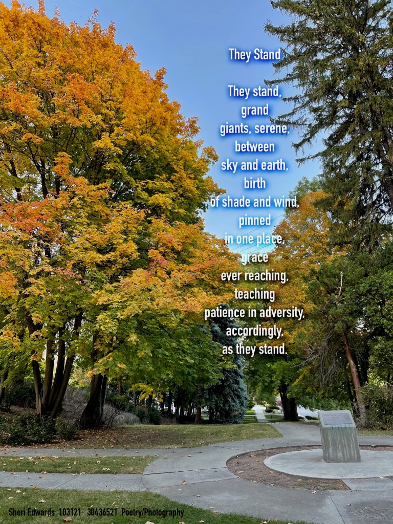 Every day, a photograph, a poem. We small creatures walk beneath them as if we are superior, and they stand in grace knowing they are essential to our survival.