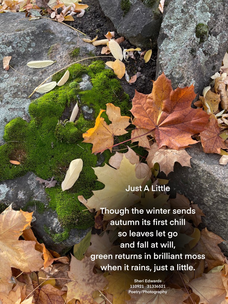 Every day, a photograph, a poem. Cloudy days, cooler days, and welcome rain brings the green moss alive and vibrant to help us see what the trees have let go, and let us enjoy that feeling, just a little.
