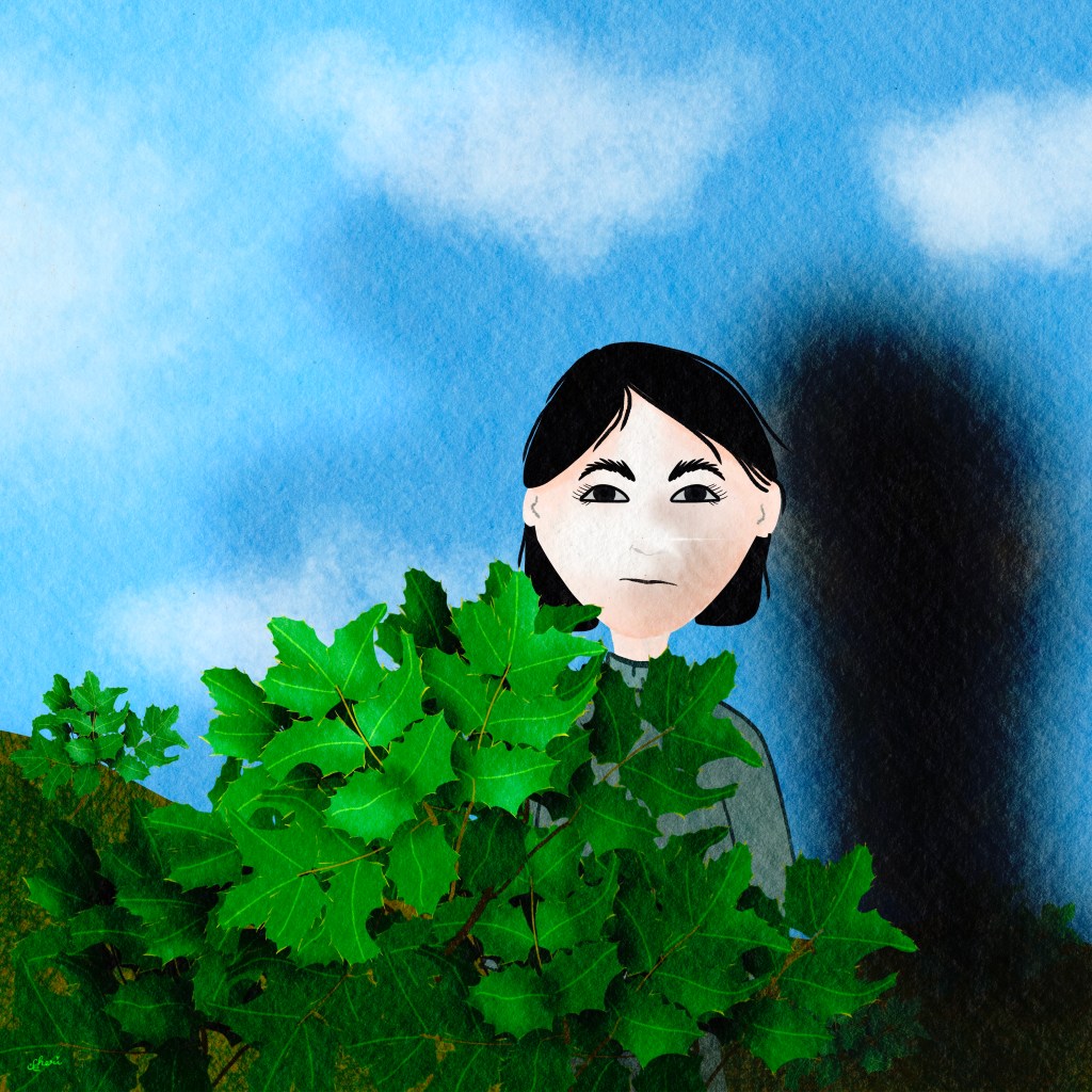 I saw Olivia, down behind an Oregon grape bush. And behind her, blackness. Not a shadow, for her body and her blackness both cast a shadow east as the sun shone through the sky dotted in cumulous clouds.