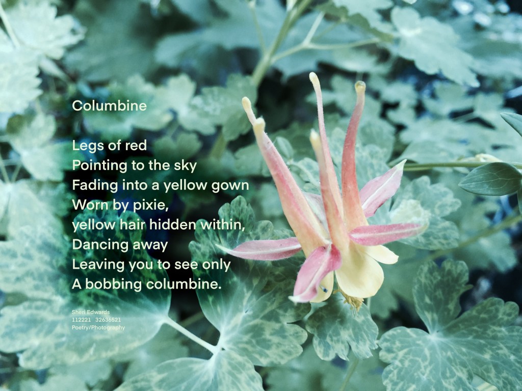 Every day, a photograph, a poem. Our garden blooms in many florals, but one I love is the magical columbine, it’s delicate leaves and delightful flower bloom all summer. It’s simply a joy to see.