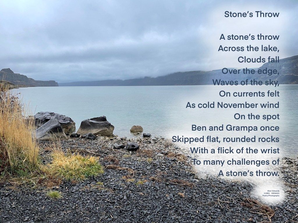 Every day, a photograph, a poem. Yesterday we drove in the cold and rain to watch the clouds roll of the cliffs of the coulee, stopping at the spot Grandpa and Ben once practice skipping rocks.