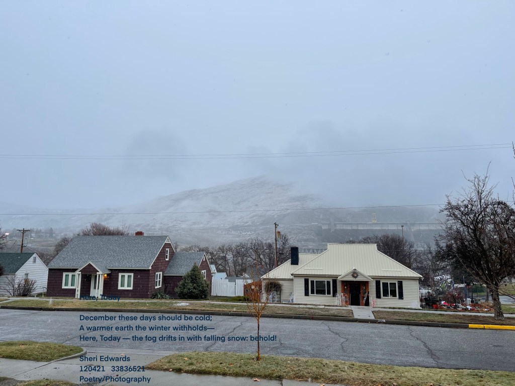 Every day, a photograph, a poem. It’s December. It’s finally trying to snow. It’s been about forty to sixty degrees the last few days— not winter weather. It makes me worried about next summer. That’s thirty degrees warmer than it should be. In the summer. 130. We won’t make it. Enjoy your time each day. The world is so different now.