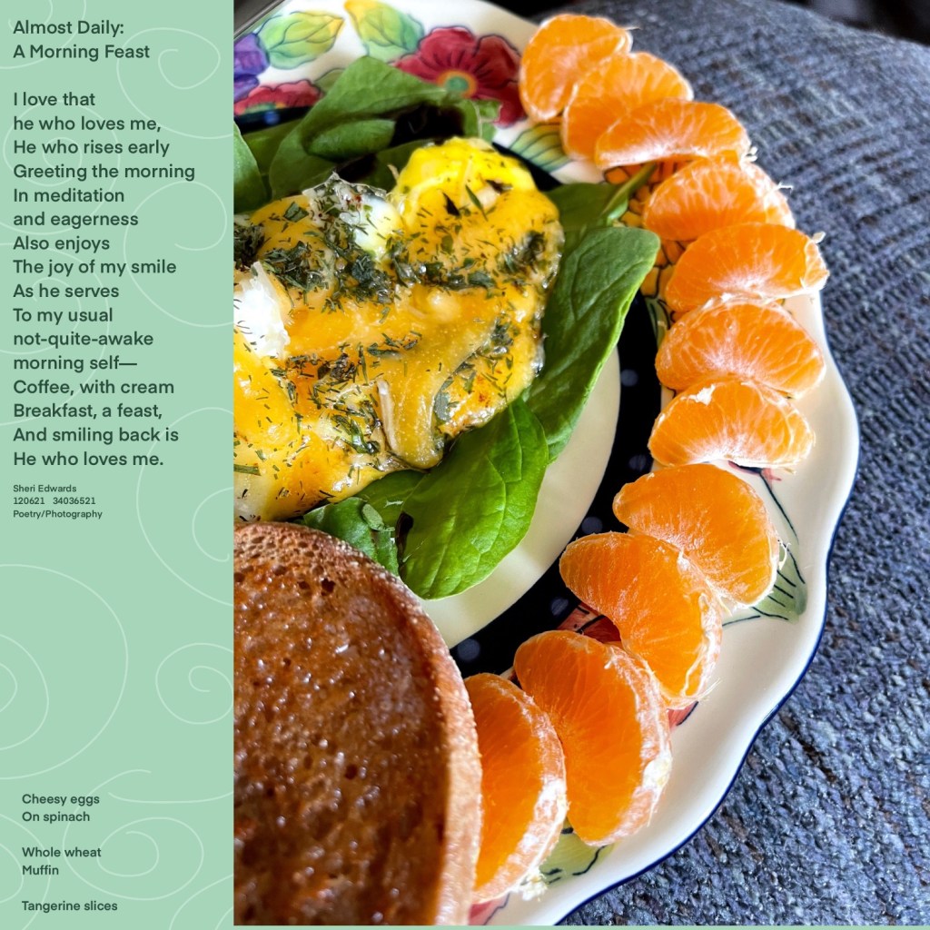Every day, a photograph, a poem. Today’s Daily Create asked for an image of a feast for St Nicholas, and often I take a picture of the lovely morning feasts that Scott prepares for me, since he’s been up and active early in the morning, and I, a night person, drag myself up, staring until I awaken fully. It’s a delightful surprise each day, for which I am always thankful, and so, a poem of gratitude to he who loves me back.