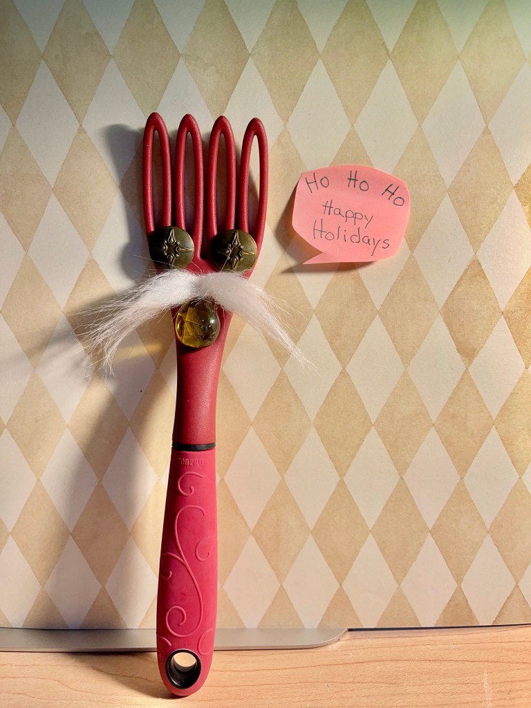 Out of household items: Fork, buttons, rock, and the tail of a cat toy