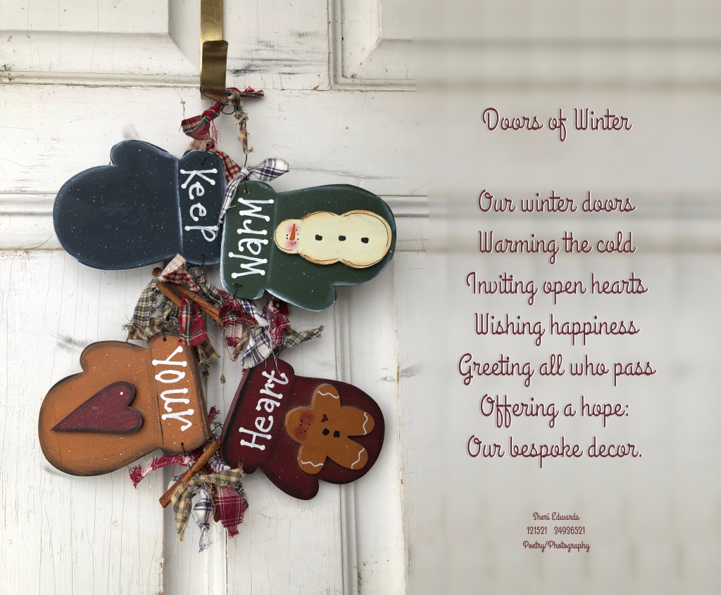 This wooden mitten display, purchased long ago at a holiday bizarre, should be stretched out a bit to say “Keep Your Heart Warm,” but it also works “Keep Warm Your Heart.” I wish for all, warm and open hearts— as this season and our lives is or should be about.