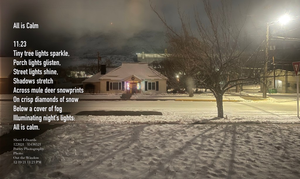 Every day, a photograph, a poem. As usual, I could not fall asleep, and I knew the snowy world would look calm and bright on this foggy December night. I could not resist a photo. Sorry I missed all the lights on the house across the street, now dimmed but for the porch lights. Perhaps I’ll remember tonight….